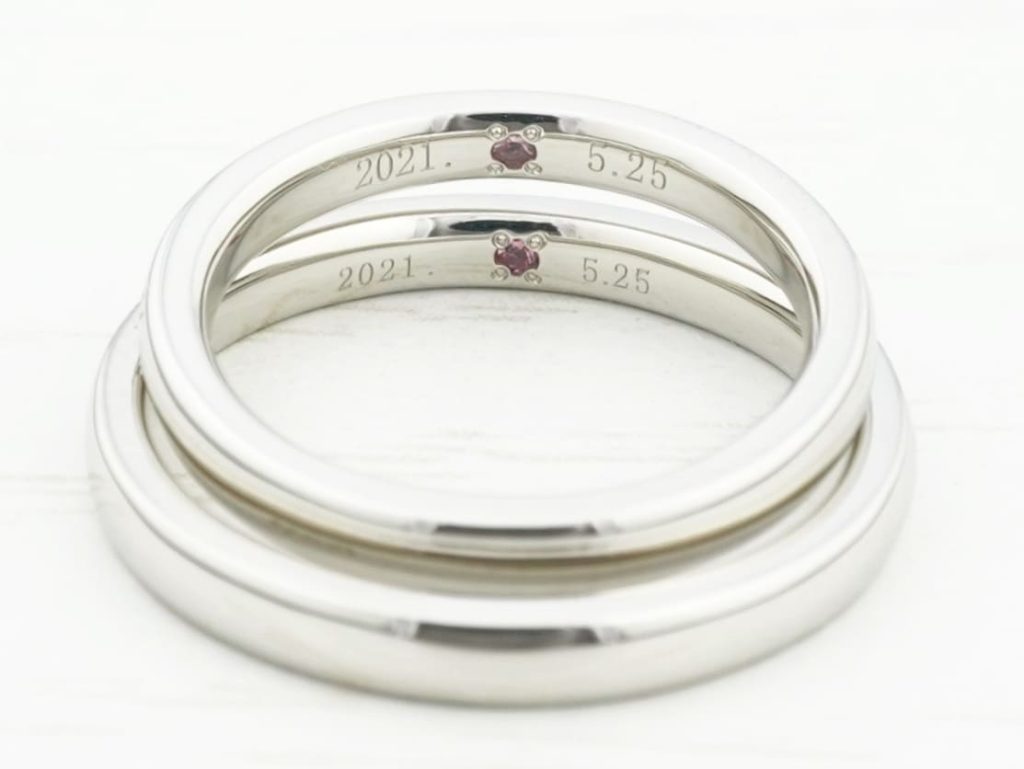 内側には入籍日を刻印。お互いの誕生石であるピンクトルマリンも留めています。