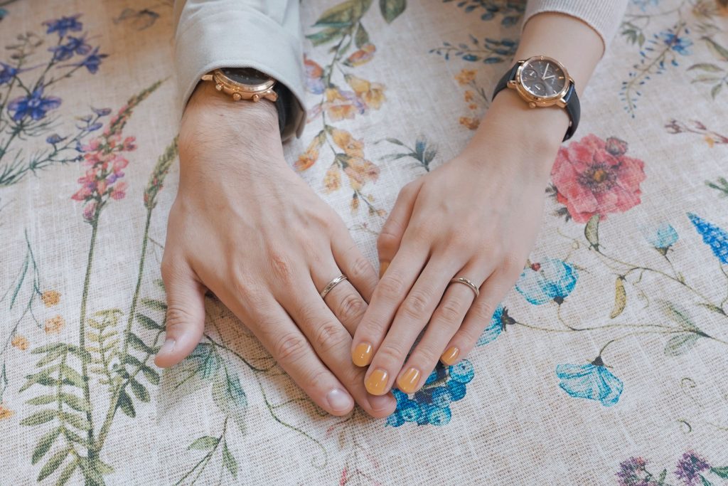 花モチーフに見えるところ、結婚指輪はデザインと素材です。