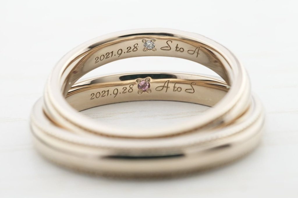 内側にはオリジナルの文字体で記念日とお互いの誕生石を留めています。