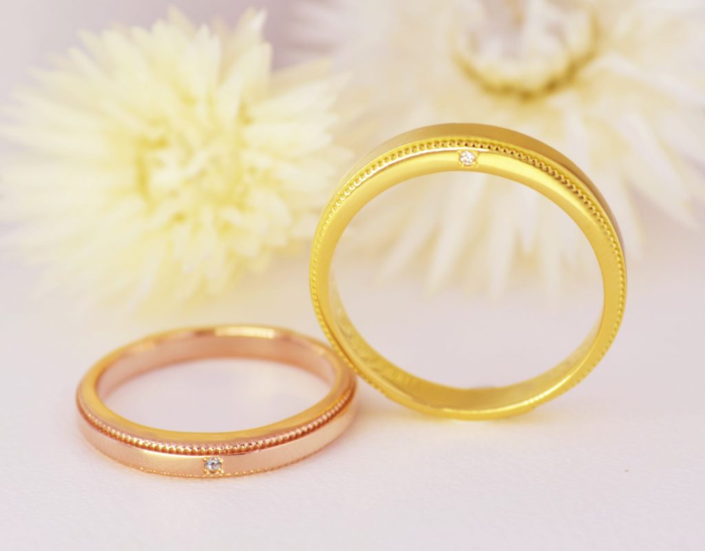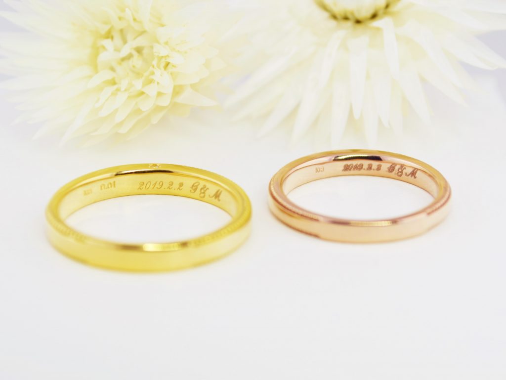 おふたりとも色付の素材がお好みということで、K18ピンクゴールドとイエローゴールドをお選び下さいました。