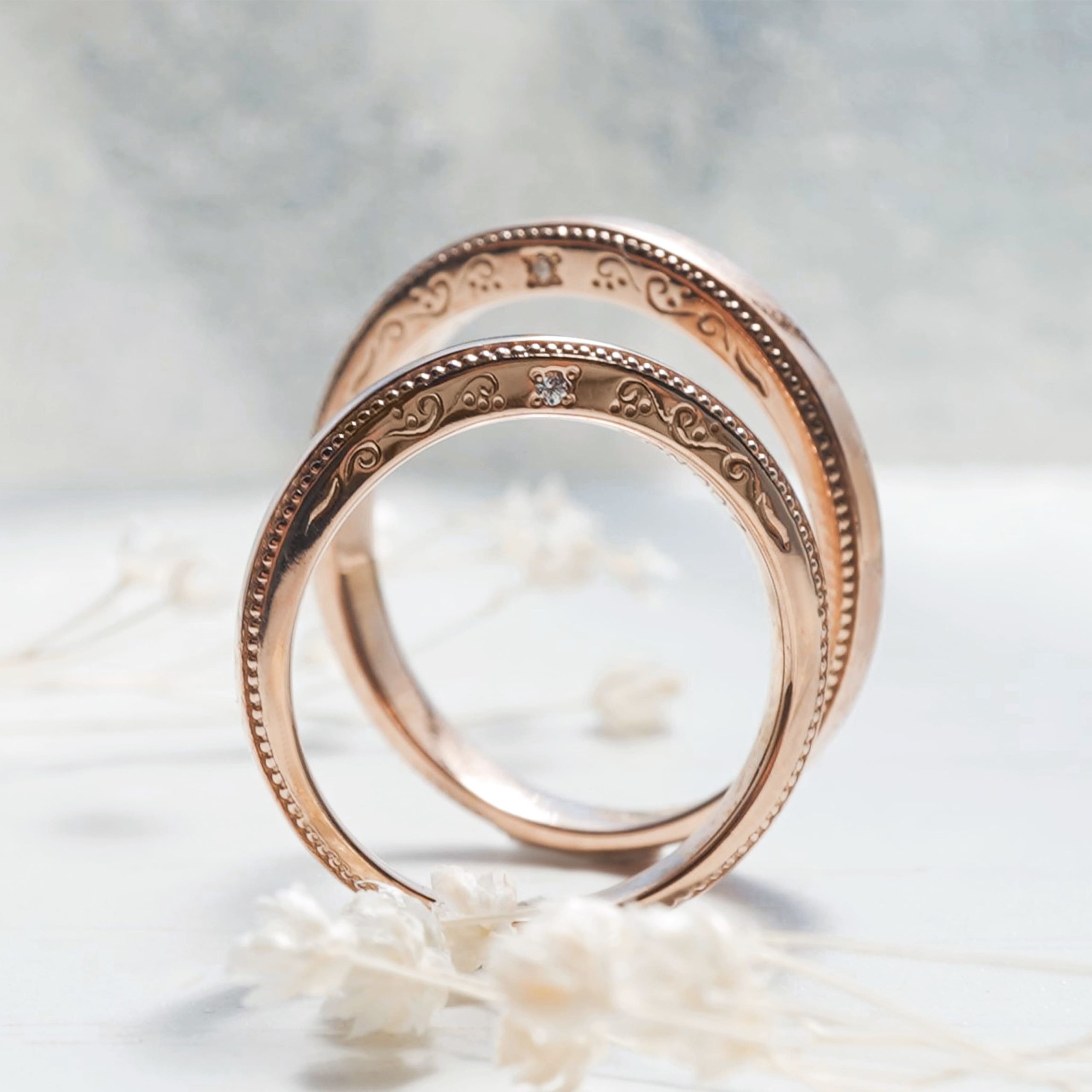 表はシンプル、サイドは華やかな鈴蘭モチーフのデザインリング Men’sはサファイヤとダイヤモンド、Lady’sはルビーとダイヤモンドの組み合わせです