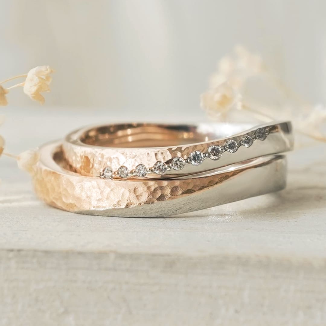 Men’s(左):K18ピンクゴールド×Pt900 幅平均2.8mm 厚み平均1.8mm Lady’s(右):K18ピンクゴールド×Pt900 幅平均2.5mm 厚み平均1.8mm ダイヤモンド10石0.05ct