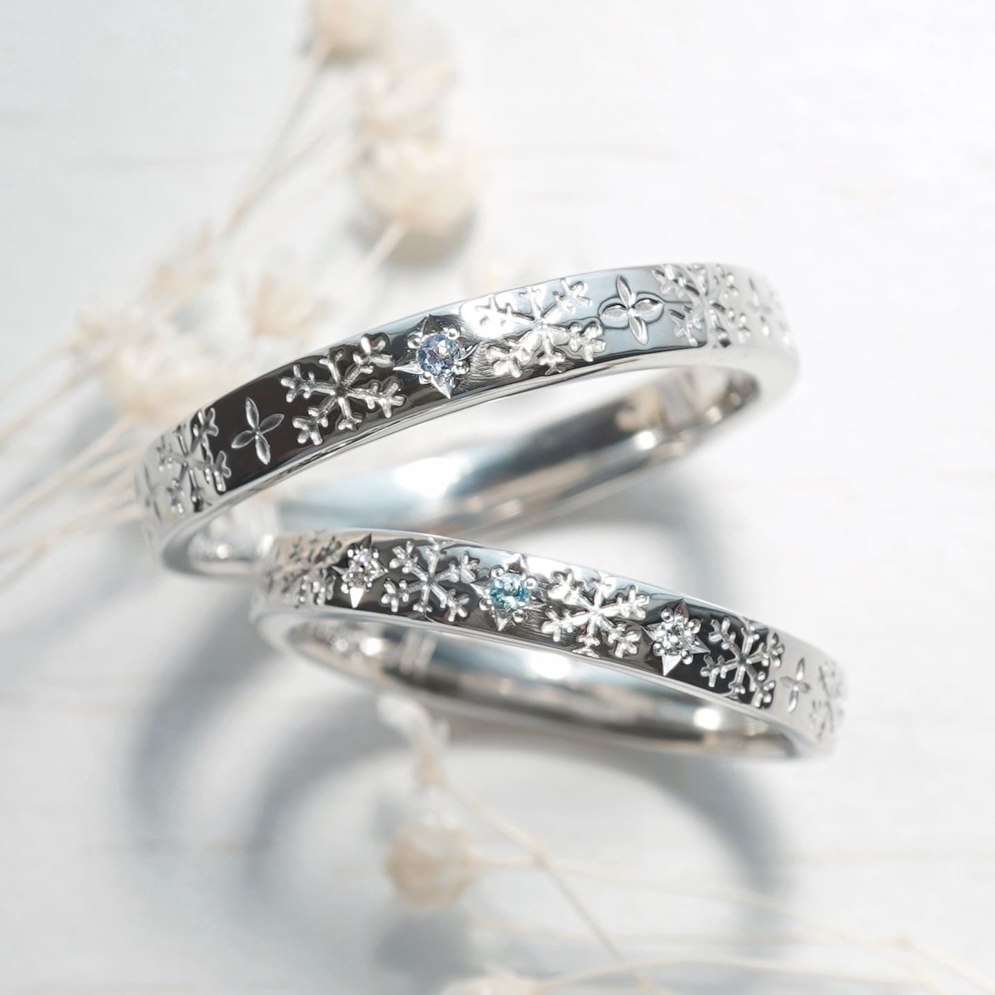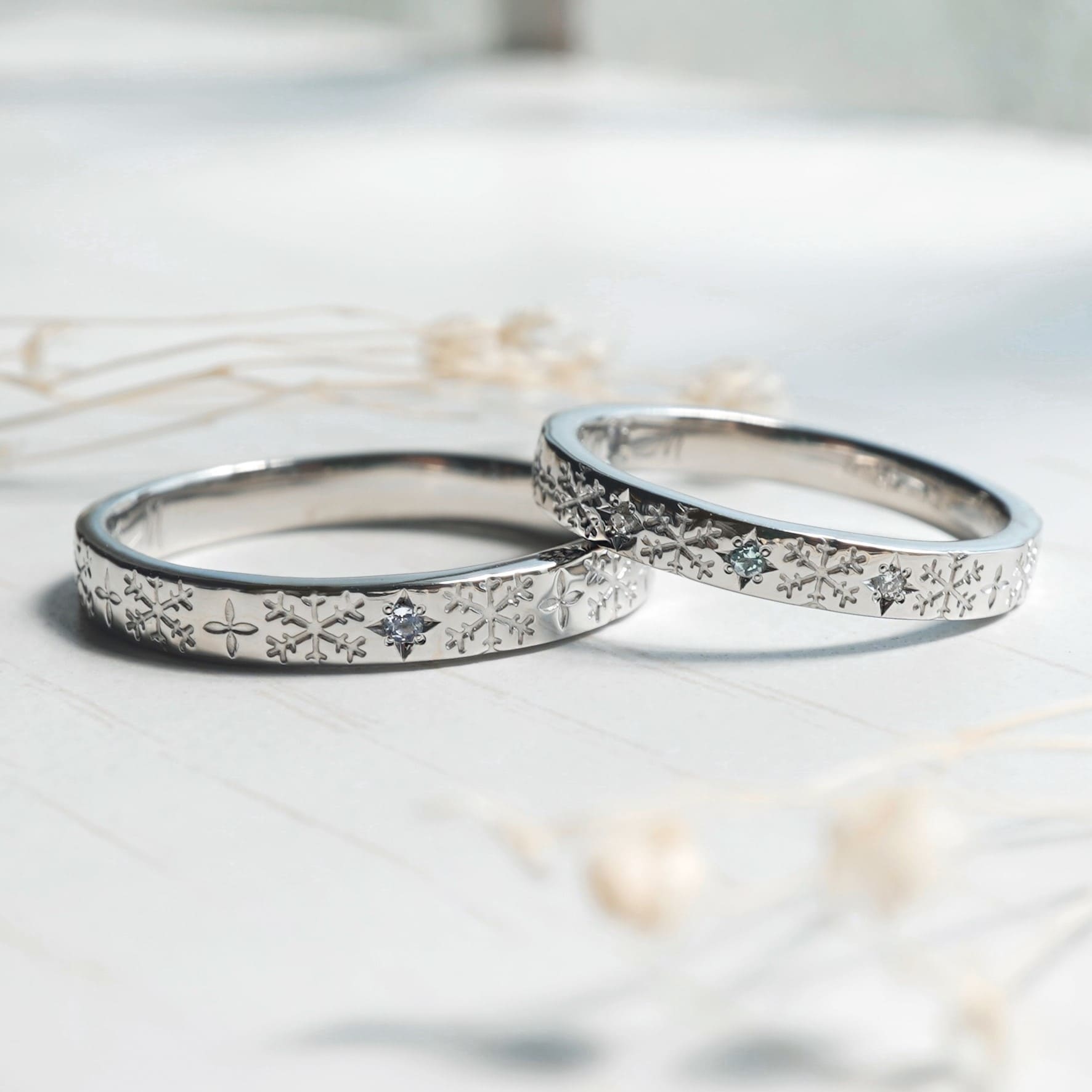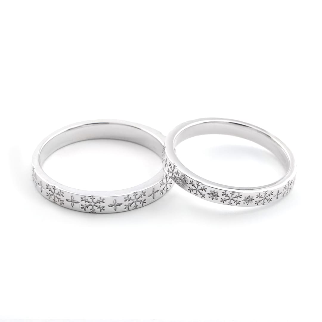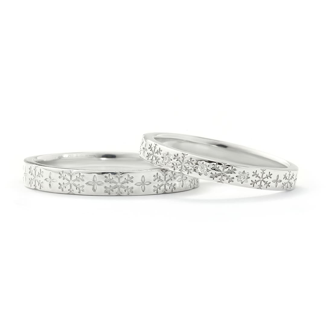 Men’s(左):PT900 幅平均2.9mm 厚み平均1.6mm Lady’s(右):PT900 ダイヤモンド3石0.01ct 幅平均2.5mm 厚み平均1.5mm ※Lady’sの誕生石をアレンジすることも可能ですので、 お問い合わせよりご連絡ください。