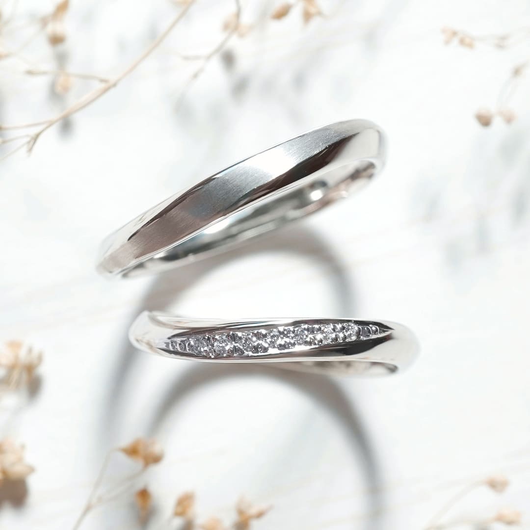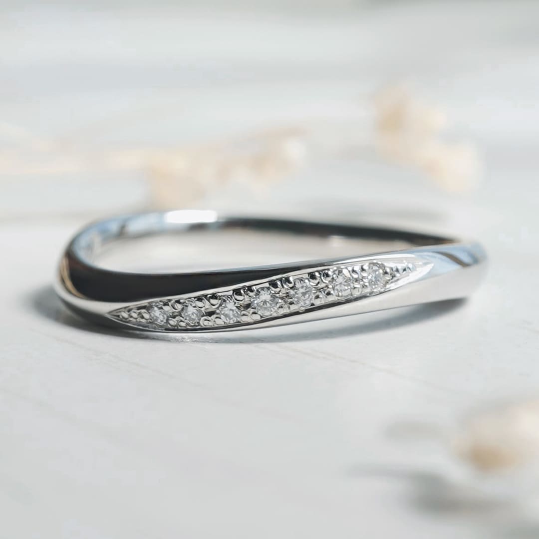 緩やかで優しいウェーブは 穏やかな川の流れのよう 移りゆく日々を愛する人と夢探しながら穏やかに過ごしていけるように 日々の幸せや願いをダイヤモンドの煌めきで表現されています