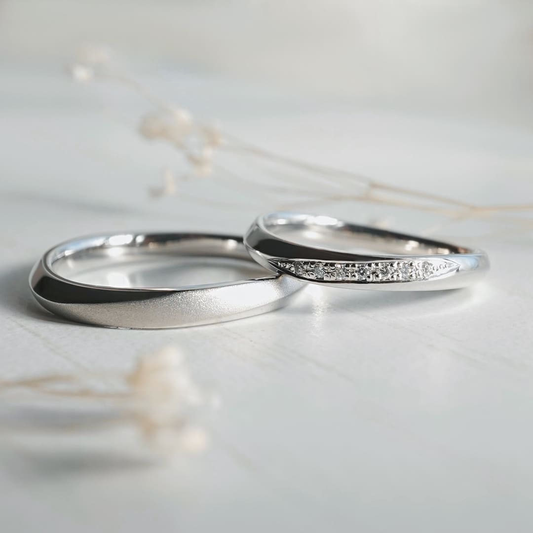 Men’s(左):PT900 幅平均2.5mm 厚み平均1.8mm Lady’s(右):PT900 ダイヤモンド7石0.03ct 幅平均2.4mm 厚み平均1.6mm