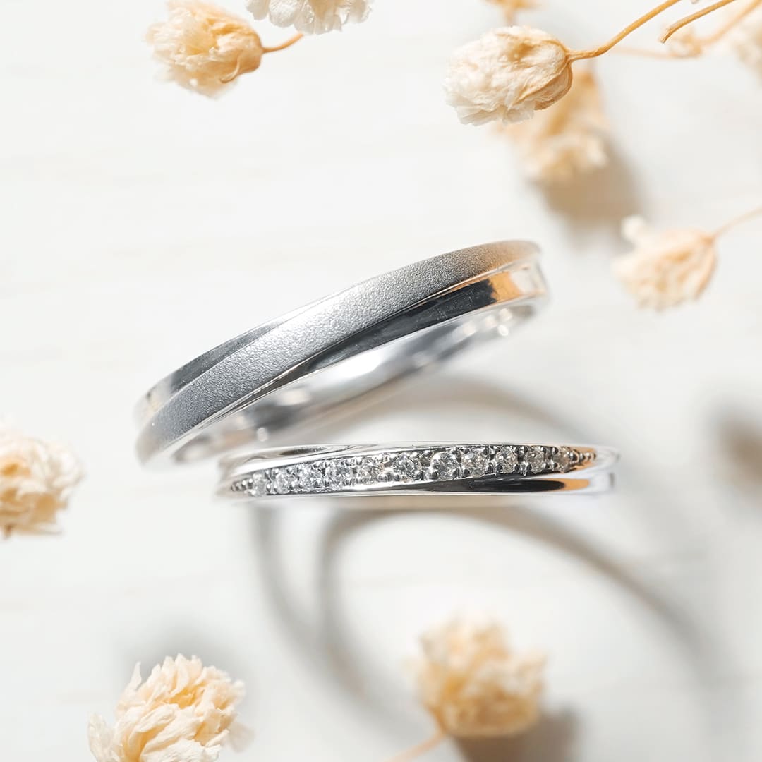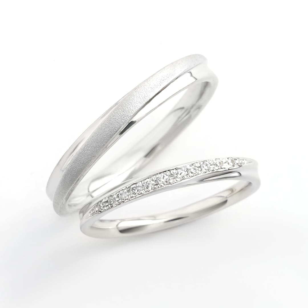 Men’s(左):PT900 幅平均2.8mm 厚み平均1.7mm Lady’s(右):PT900 ダイヤモンド11石0.06ct 幅平均2.1mm 厚み平均1.6mm