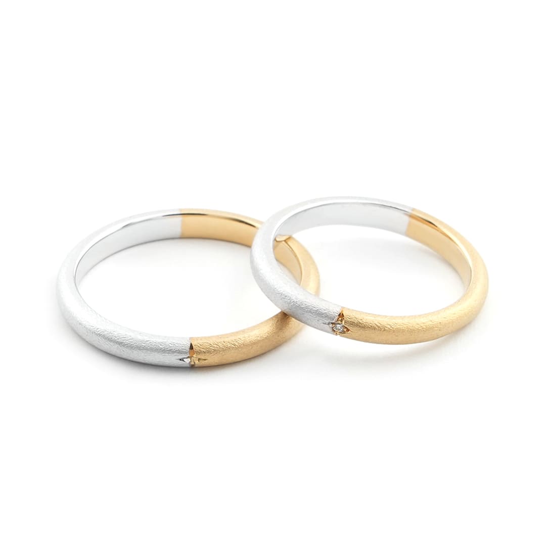 ふたりの未来が、幸せが一つになって輝く様子を表現した指輪 Men’sは星彫り、Lady’sはダイヤモンド1石を星留め、どちらとも表面は梨地仕上げを施しています