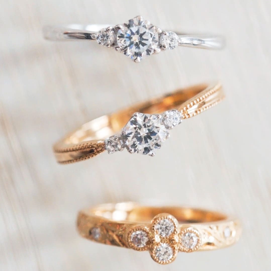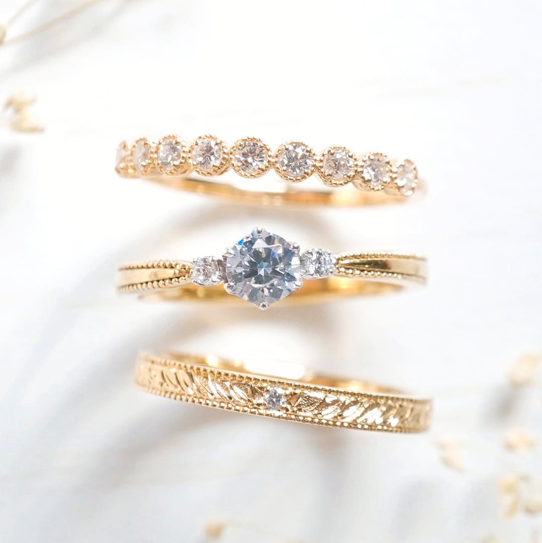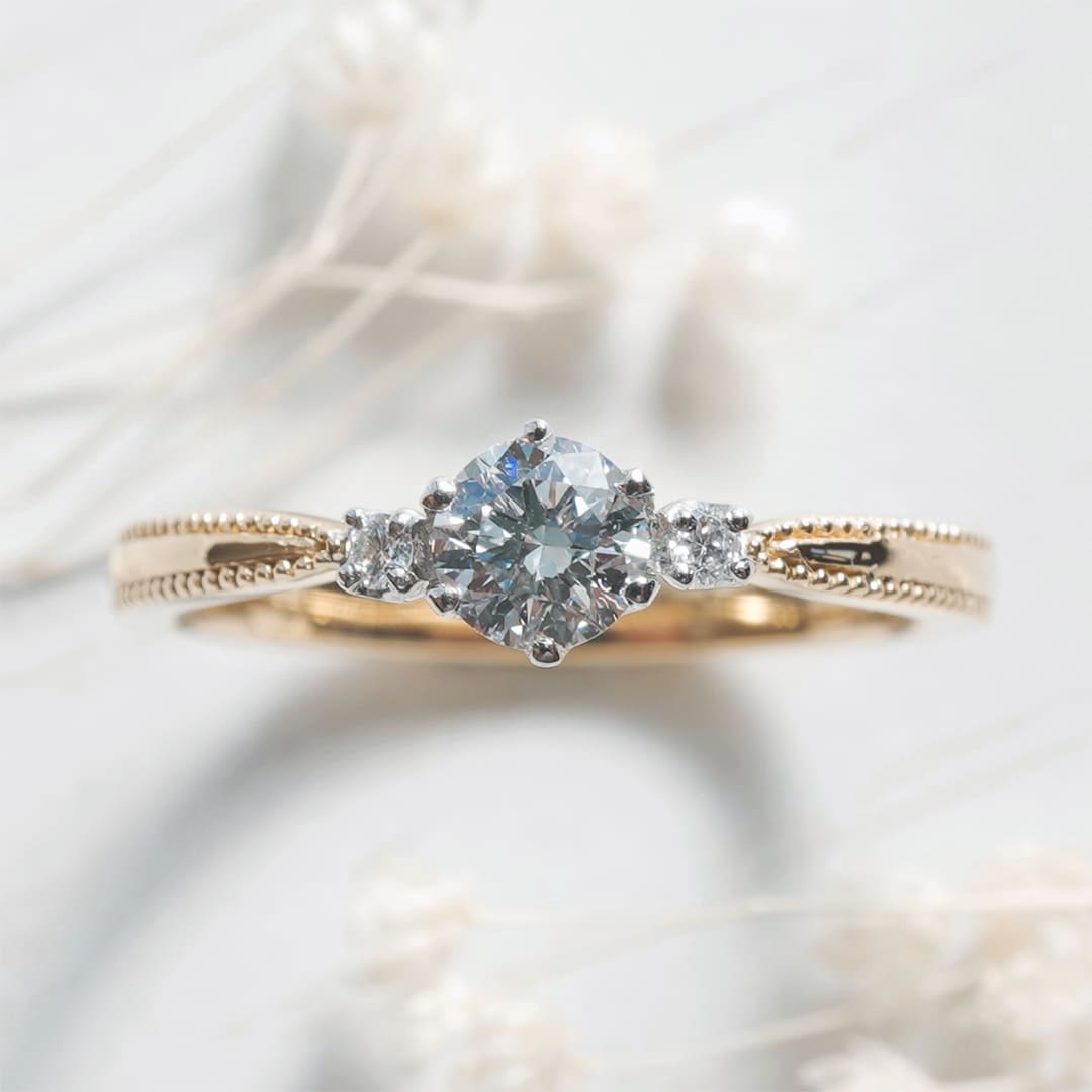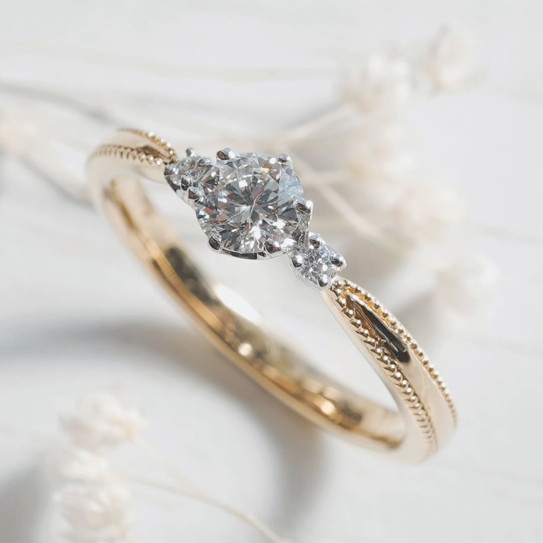 センターダイヤモンドと脇石部分にはPT900を使用。ダイヤの輝きが黄色枠にとらわれないデザインです。枠部分にはミルグレイン加工を施しています。 ダイヤ留めの中央部分PT900は素材を変更できません。枠は素材を変えることが可能です。単色でも作製可能です。