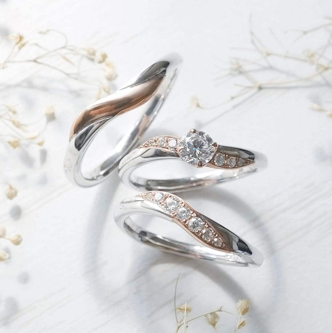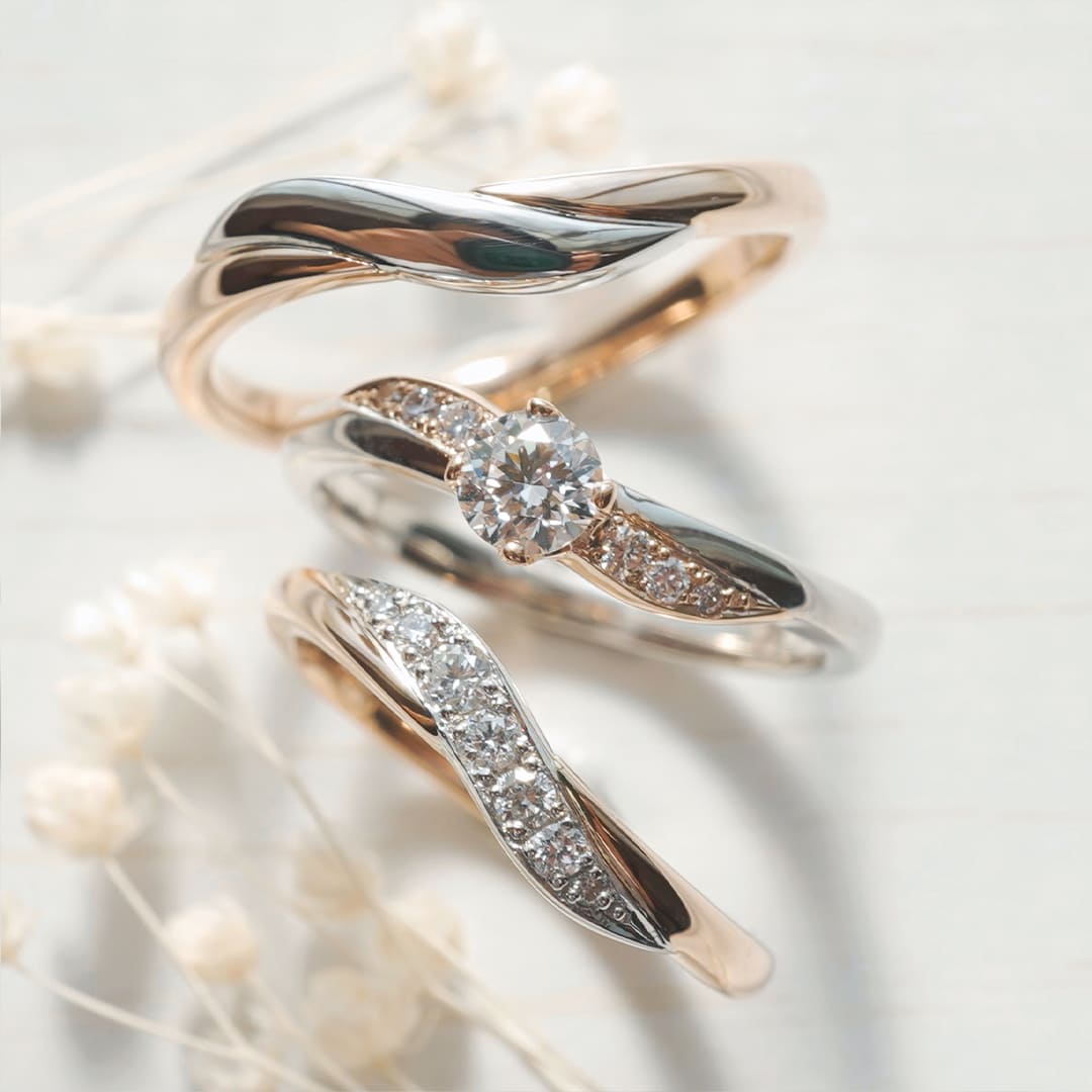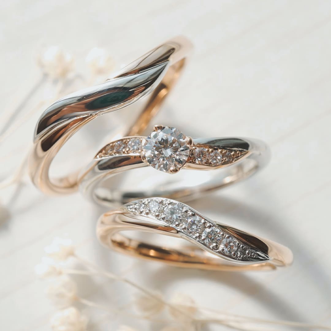 薔薇の束に見える指輪 二凛のバラの意味は「この世界はふたりだけ」 セットリングのロゼはバラ一本 三本が揃えば「愛しています」という意味に セットリングに込められたロマンチックな由来のリング
