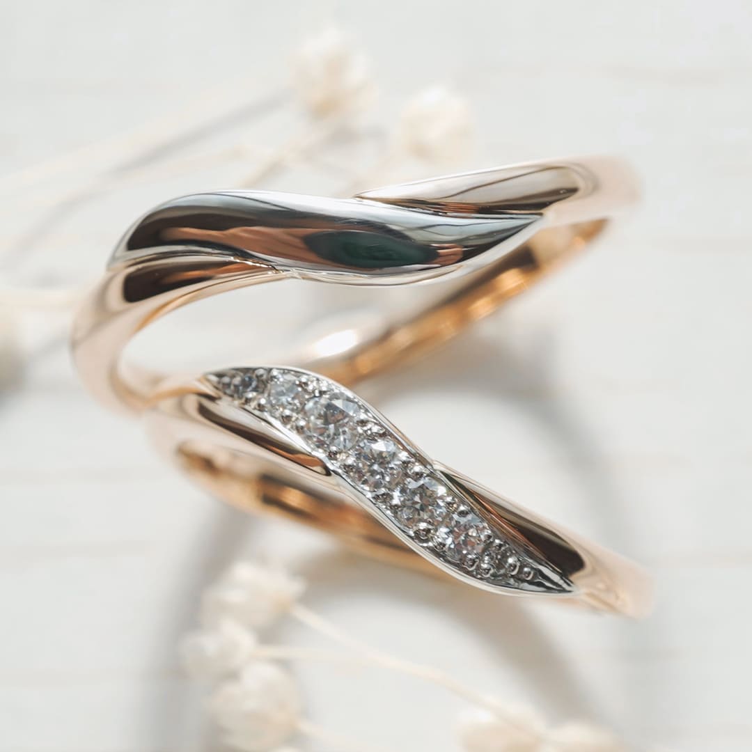 Men’s(左):PT900/K18ピンクゴールド 幅平均2.8mm 厚み平均1.6mm Lady’s(右):PT900/K18ピンクゴールド ダイヤモンド7石0.08ct 幅平均2.8mm 厚み平均1.6mm