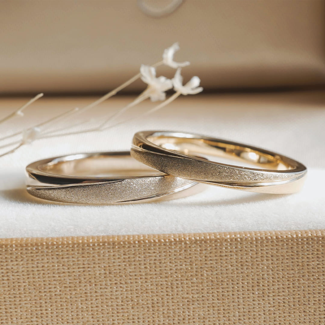 Men’s(左):K18シャンパンゴールド 幅平均2.7mm 厚み平均1.6mm Lady’s(右):K18シネマゴールド 幅平均2.4mm 厚み平均1.6mm