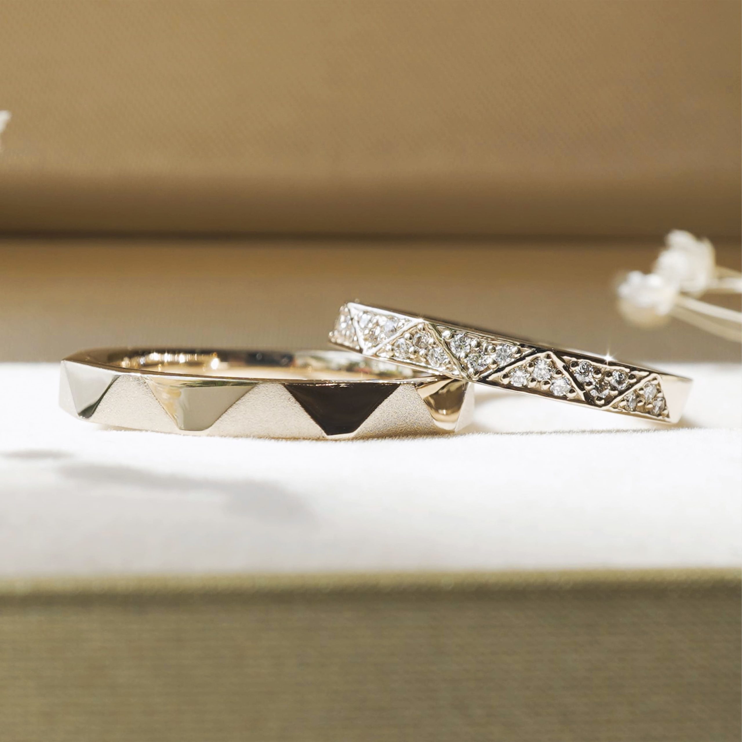 Men’s(左):K18シャンパンゴールド 幅平均2.7mm 厚み平均1.8mm Lady’s(右):K18シャンパンゴールド ダイヤモンド33石0.18ct 幅平均2.5mm 厚み平均1.8mm