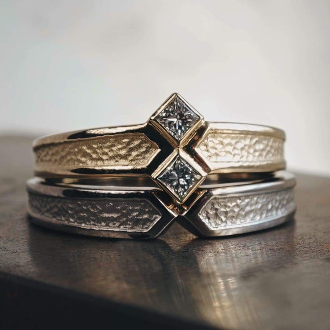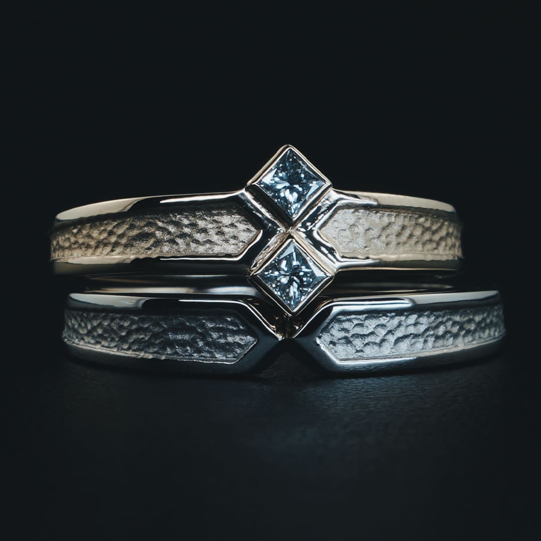 Men’s(左):K18ブラック 最大幅3.9mm 最小幅2.3mm 厚み平均1.7mm Lady’s(右):K18シネマゴールド ダイヤ留め幅8mm 腕部分最大幅3.9mm 腕部分最大幅2.3mm 厚み平均1.7mm スクエアダイヤモンド2石 0.16ct