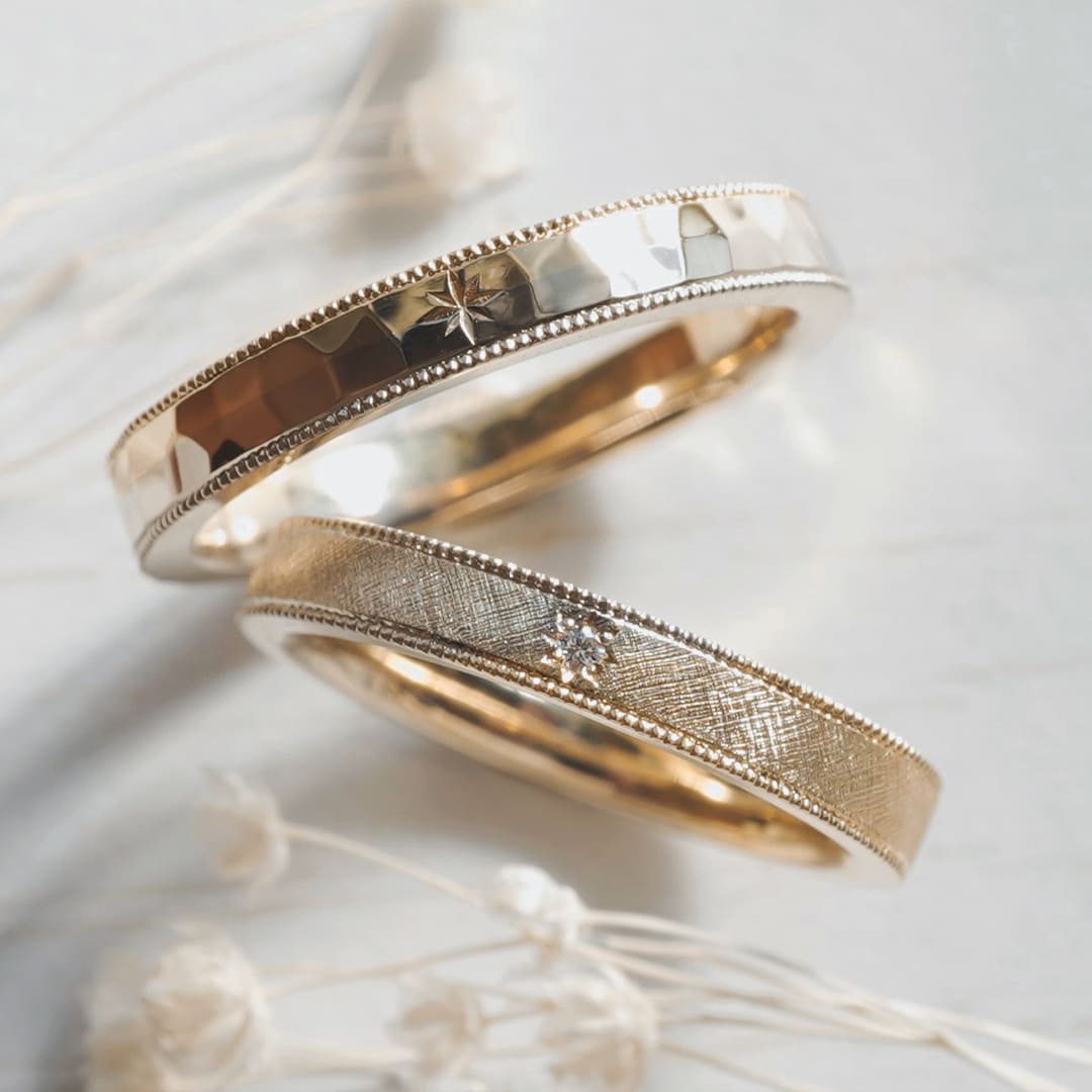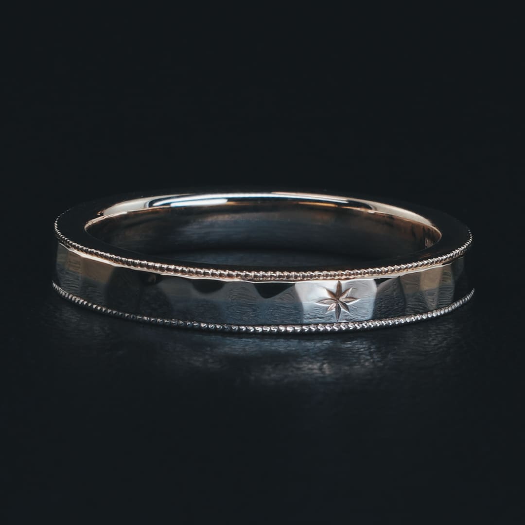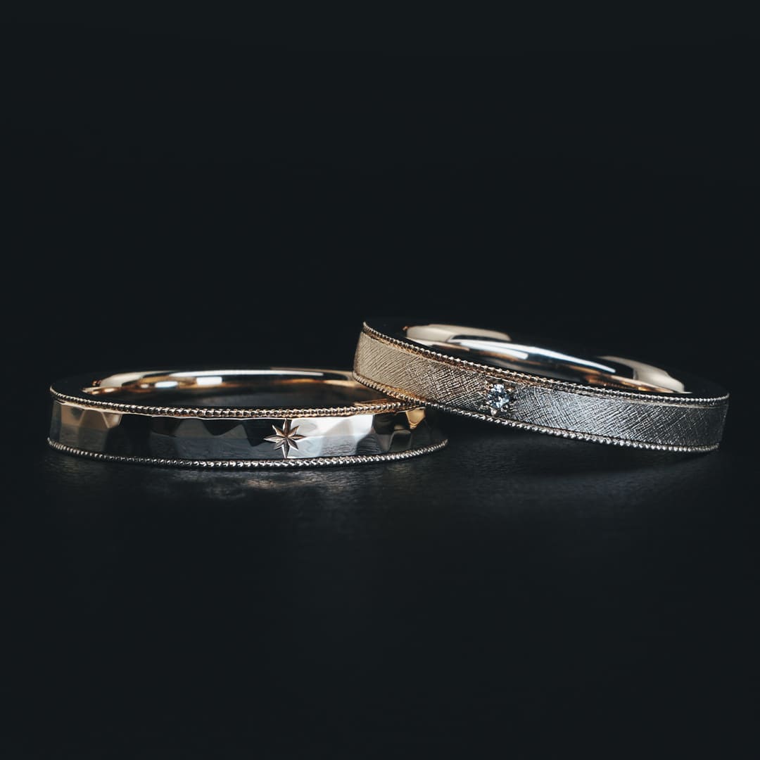 Men’sリングは朝焼けがテーマ 槌目で清々しさを表現 Lady’sリングは夕焼けがテーマ 網目状のフレア加工が美しく輝くデザインです どちらも異素材を組み合わせたリングになります
