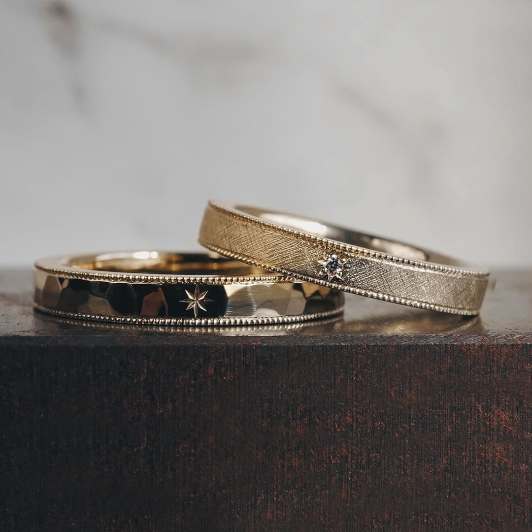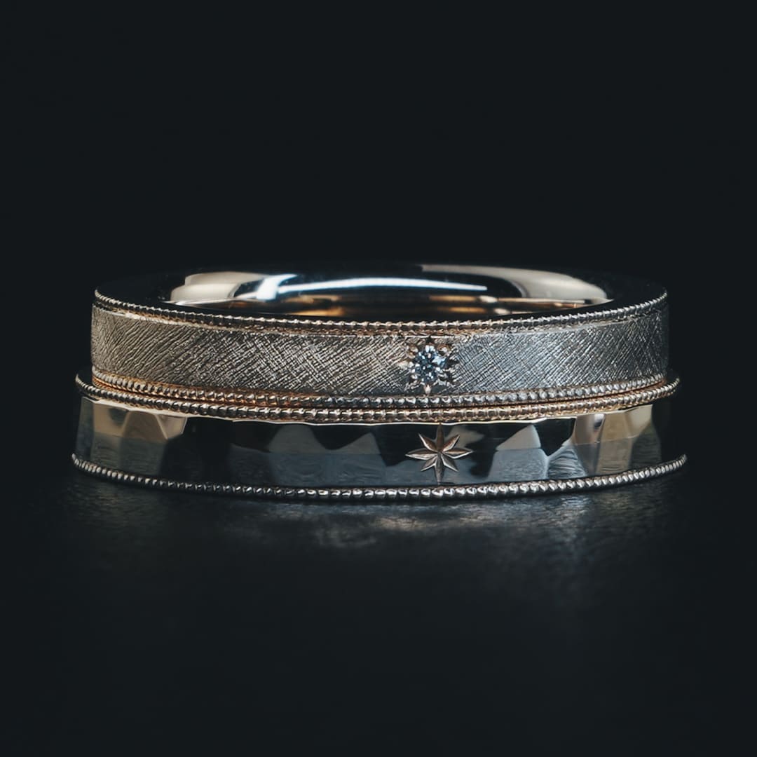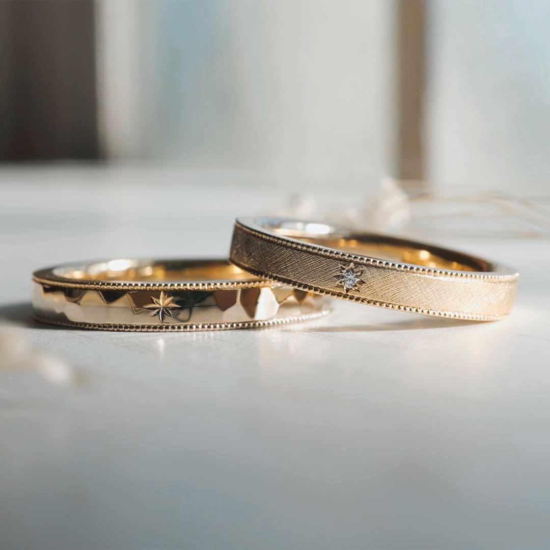 Men’sリングは朝焼けがテーマ 槌目で清々しさを表現 Lady’sリングは夕焼けがテーマ 網目状のフレア加工が美しく輝くデザインです どちらも異素材を組み合わせたリングになります