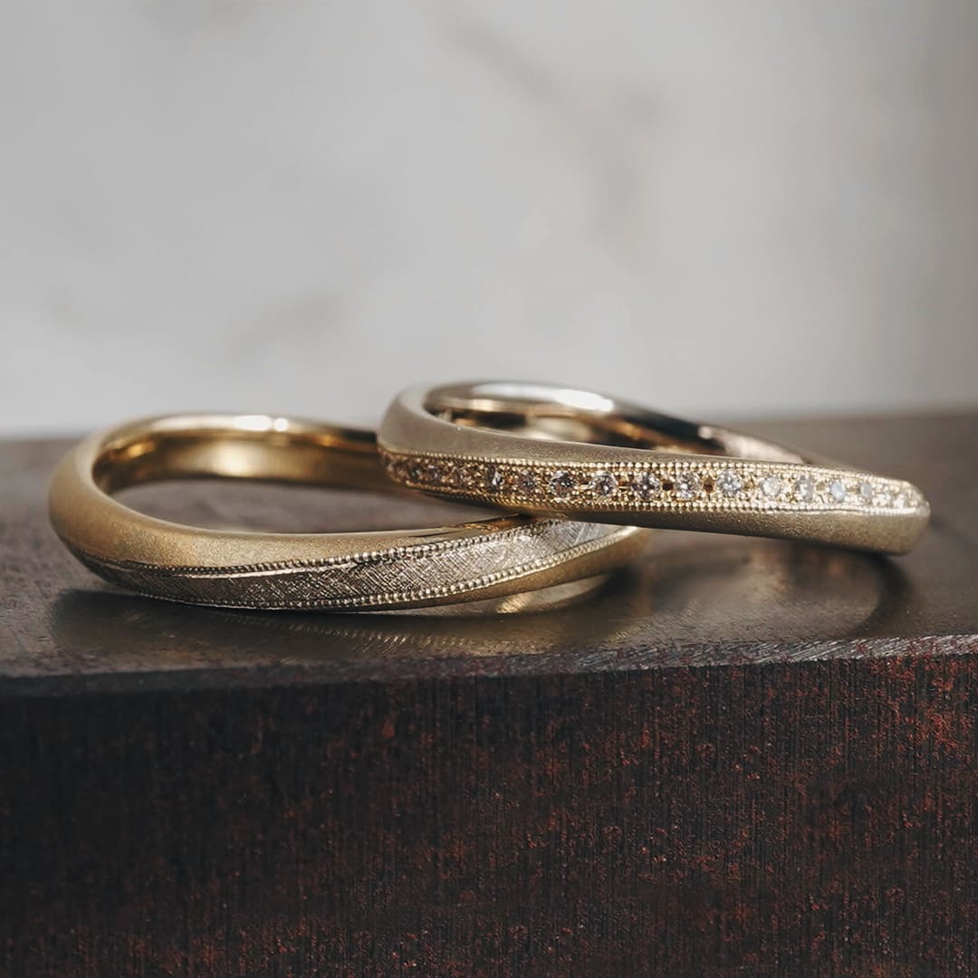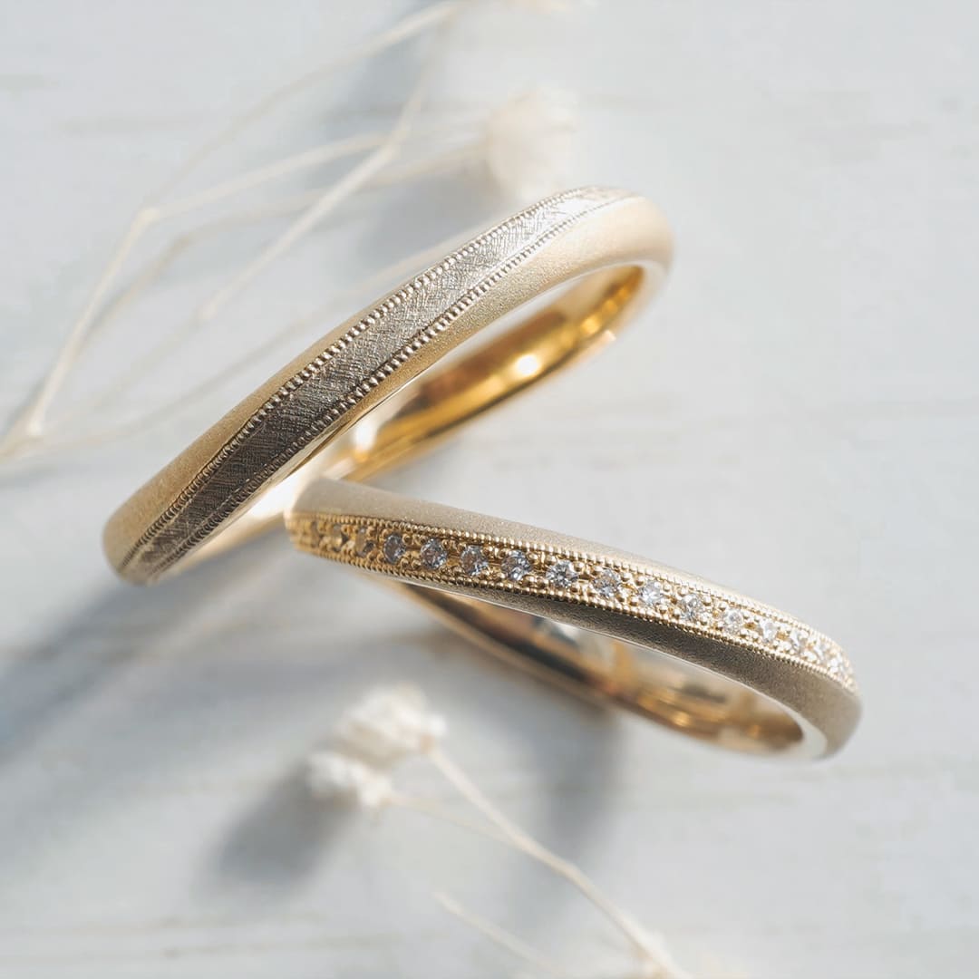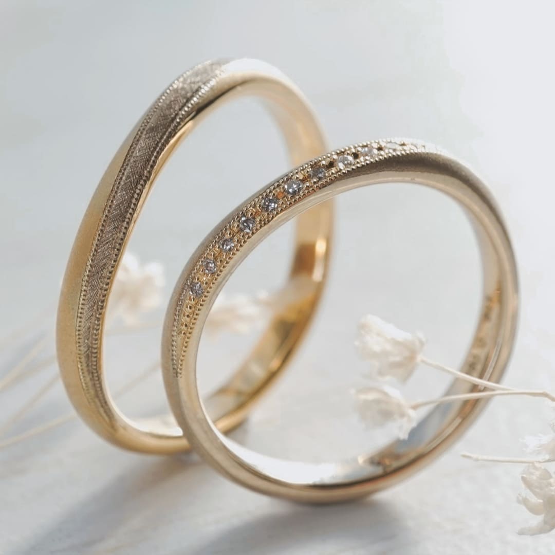Men’s(左):K18シャンパン×K18イエロー 幅平均2.5mm 厚み平均1.7mm Lady’s(右):K18イエロー×K18シャンパン ダイヤモンド23石0.086ct 幅平均2.5 mm 厚み平均1.7mm