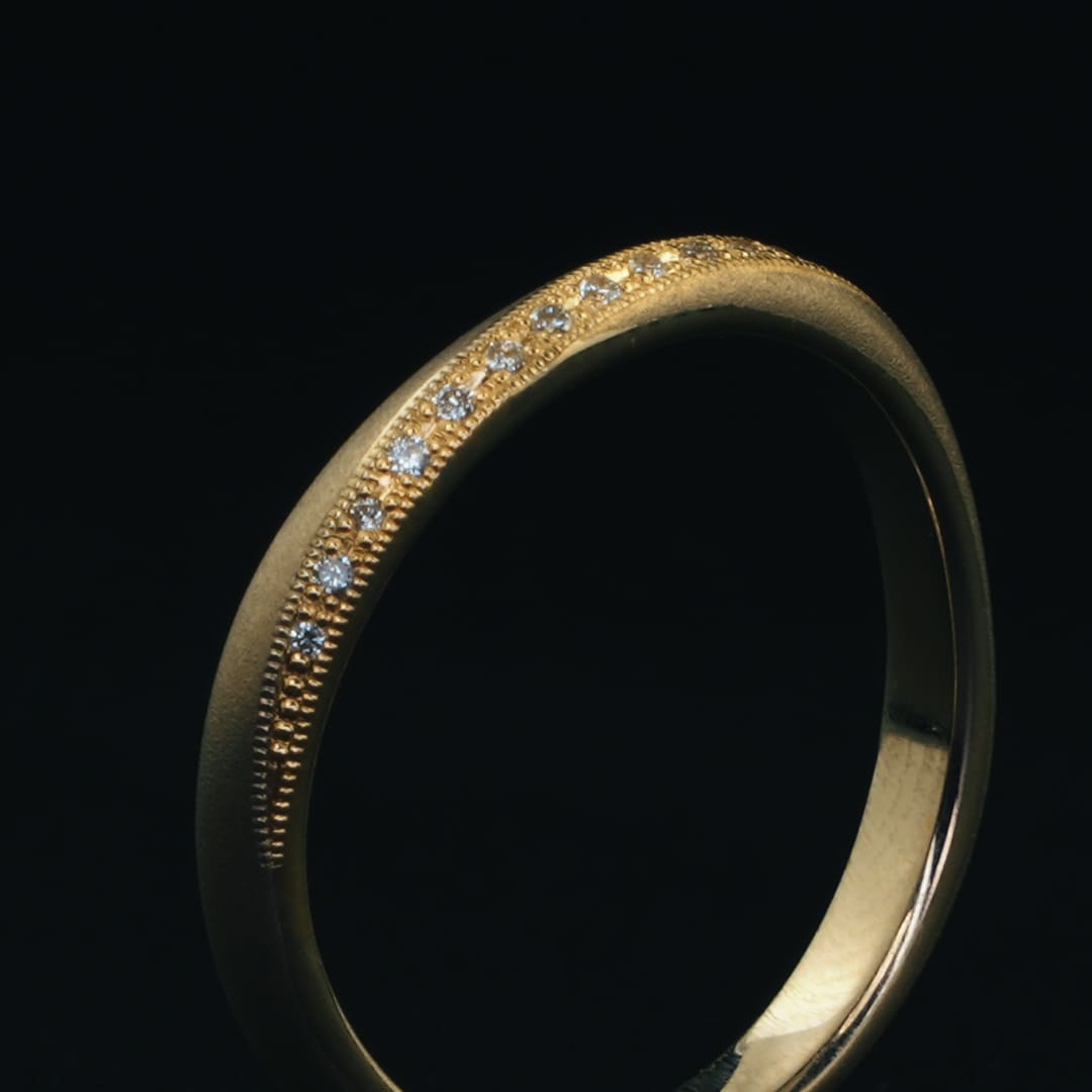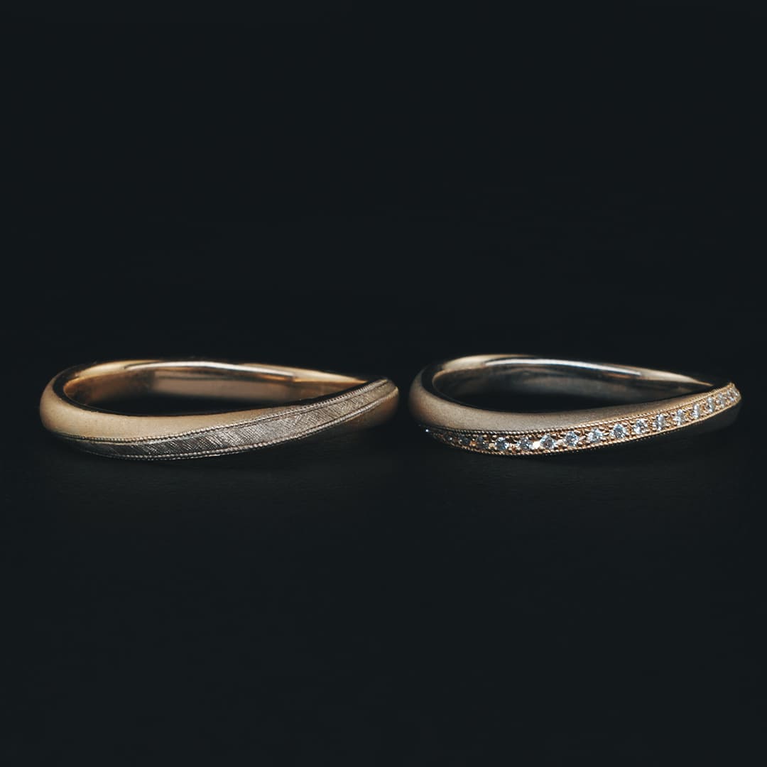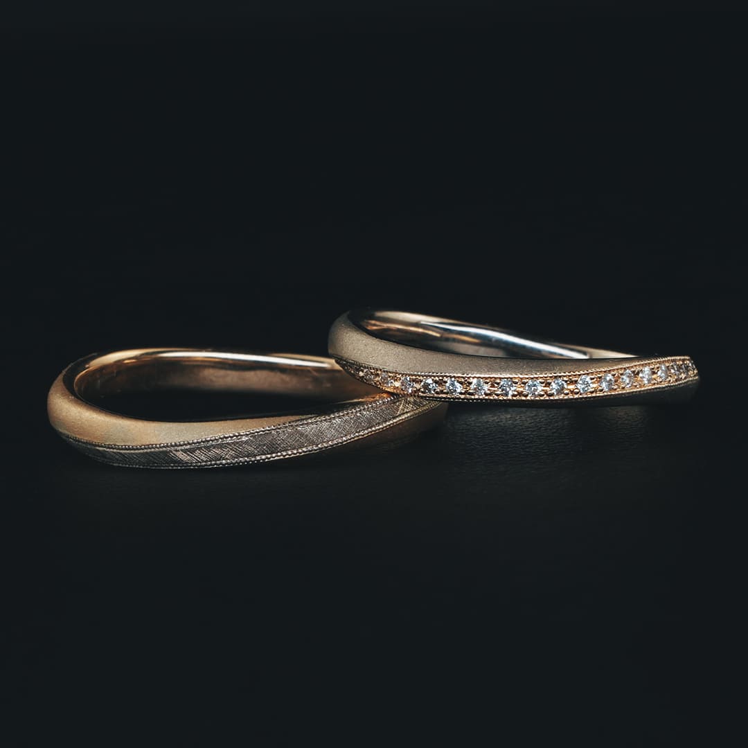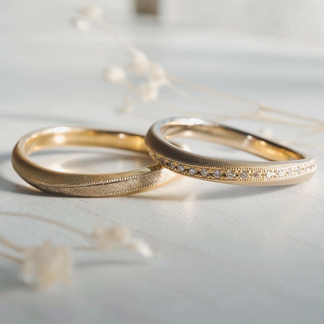 Men’s(左):K18シャンパン×K18イエロー 幅平均2.5mm 厚み平均1.7mm Lady’s(右):K18イエロー×K18シャンパン ダイヤモンド23石0.086ct 幅平均2.5 mm 厚み平均1.7mm