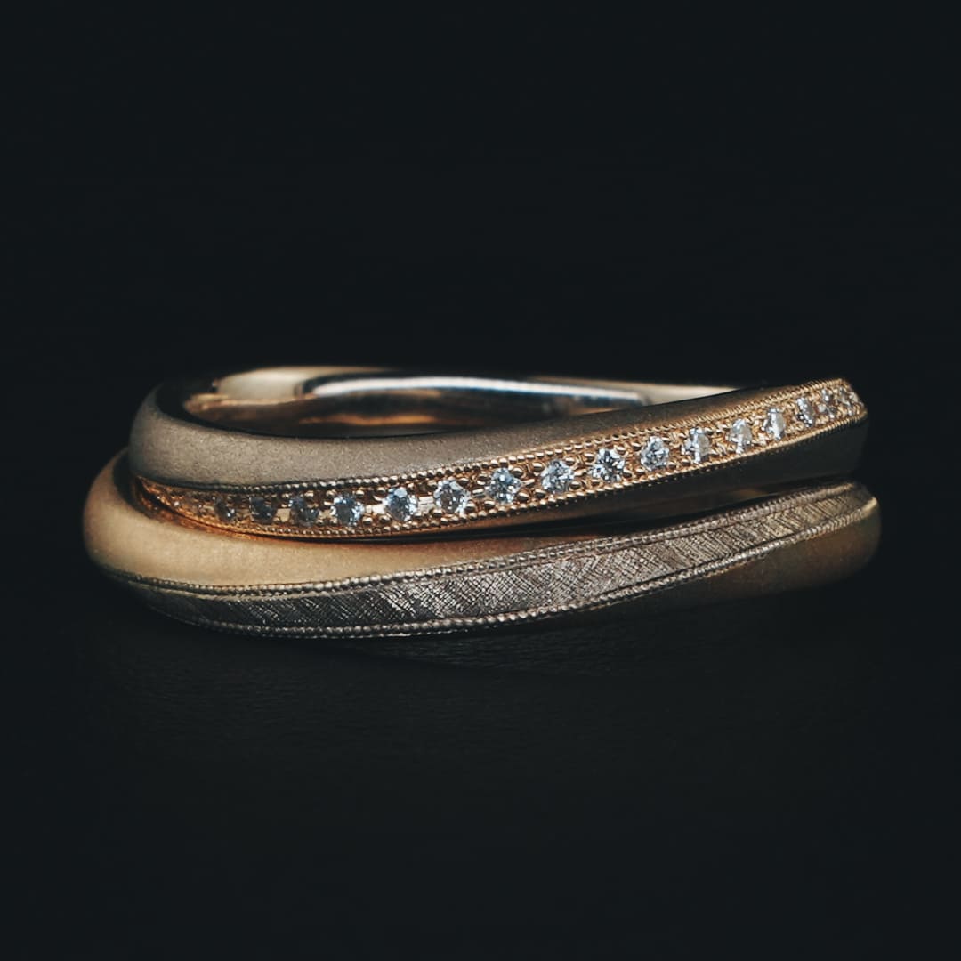 夜空に輝く無数の星たち Men’sリングではフレア加工で夜空の輝きを表現 Lady’sリングにはダイヤモンドを23石留め、流れ星をイメージ どちらも異素材を組み合わせた指輪になります