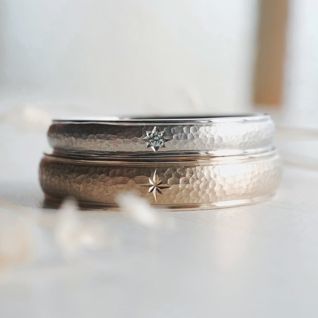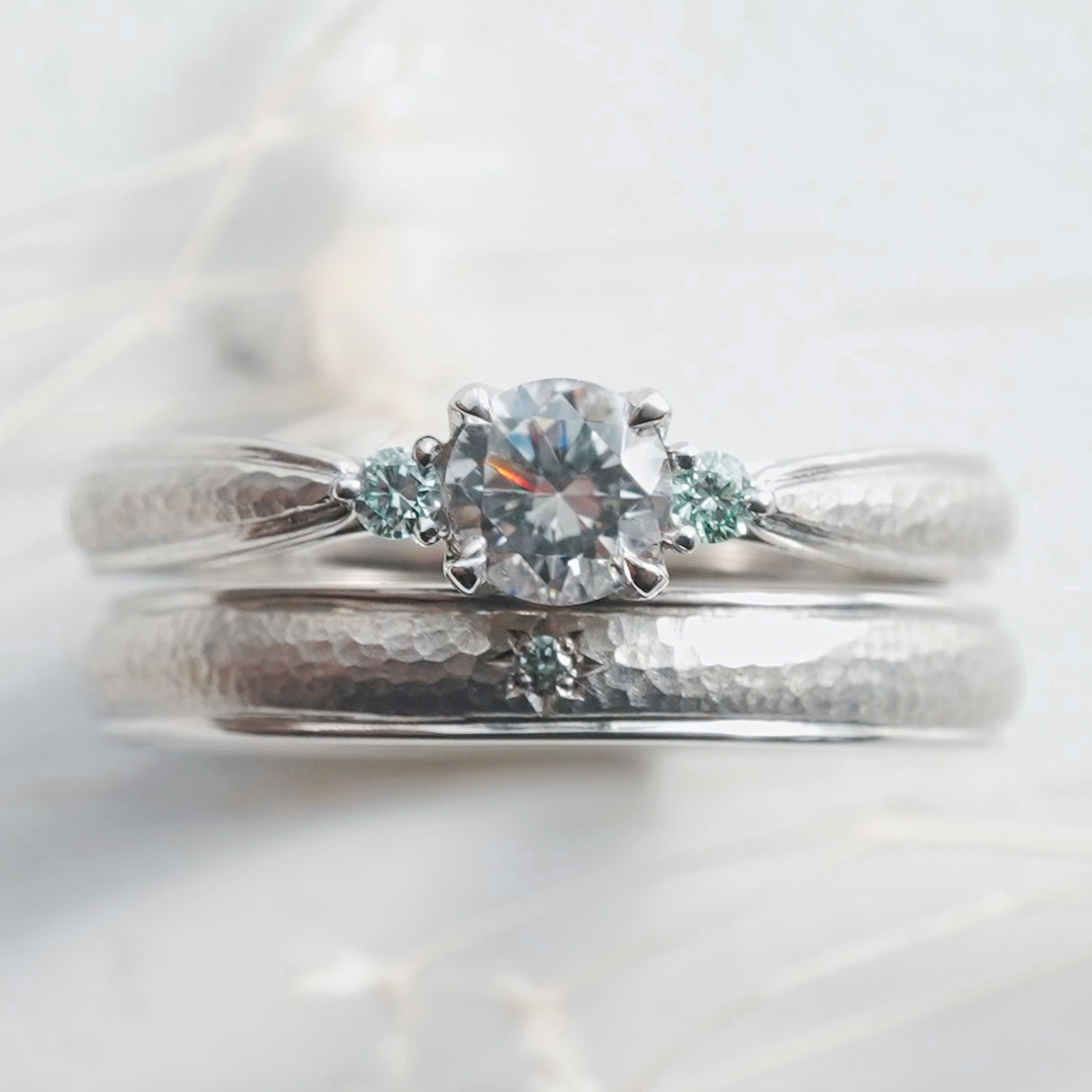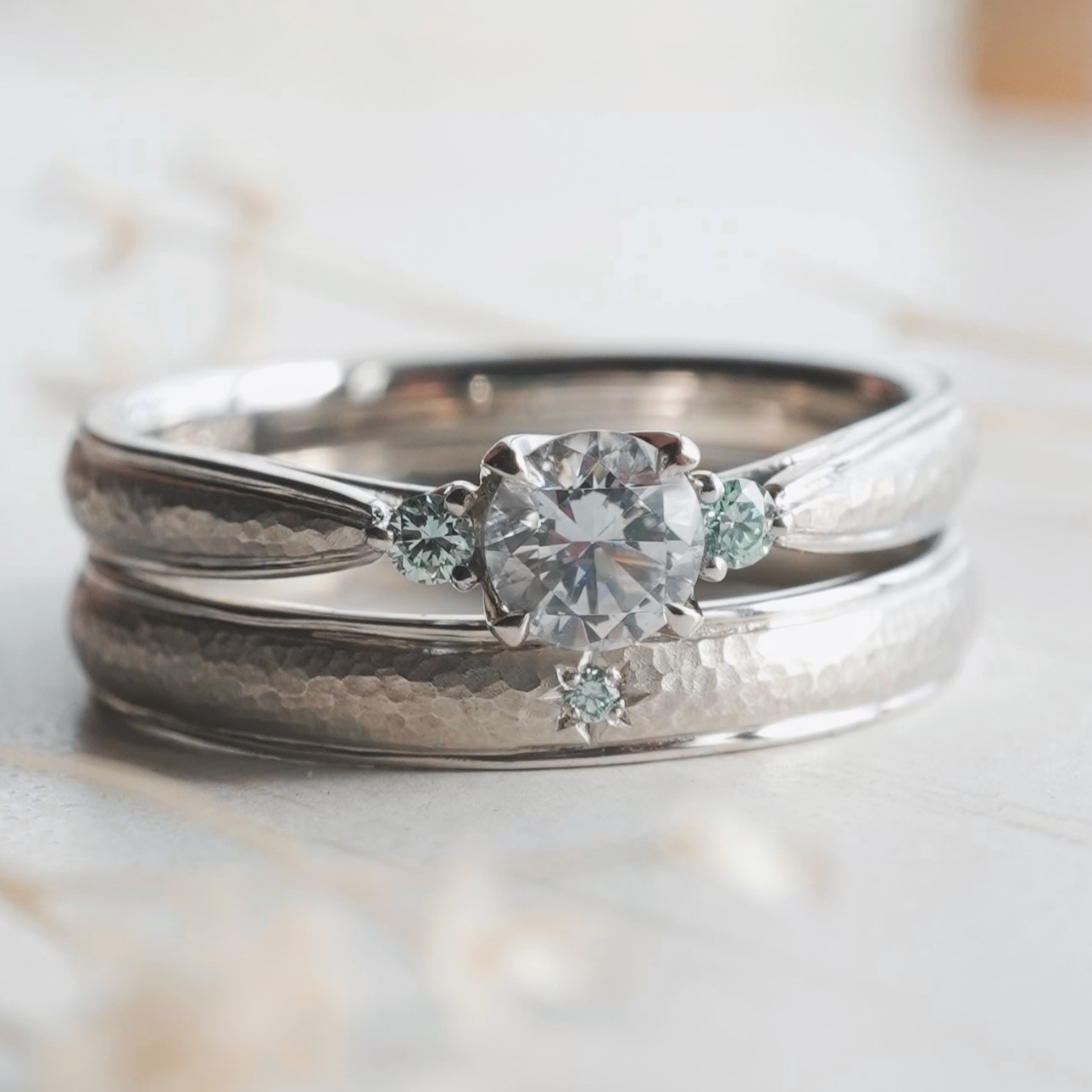 ゆったりと動く雲の流れ、澄み切った青い空に輝く一筋の光 婚約指輪のCiel/シエルとはセットリングになります 表面は鏨(タガネ)で槌目とつや消しを施しています 上下の縁はフラットな表面ですが、ミルグレインを付けることも可能です
