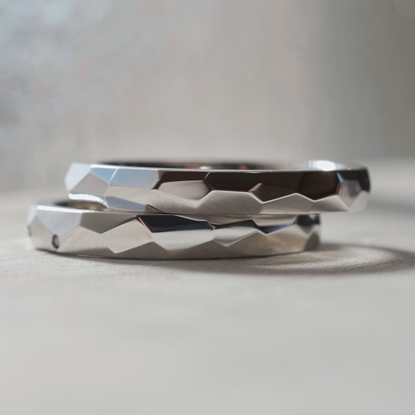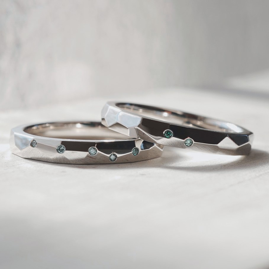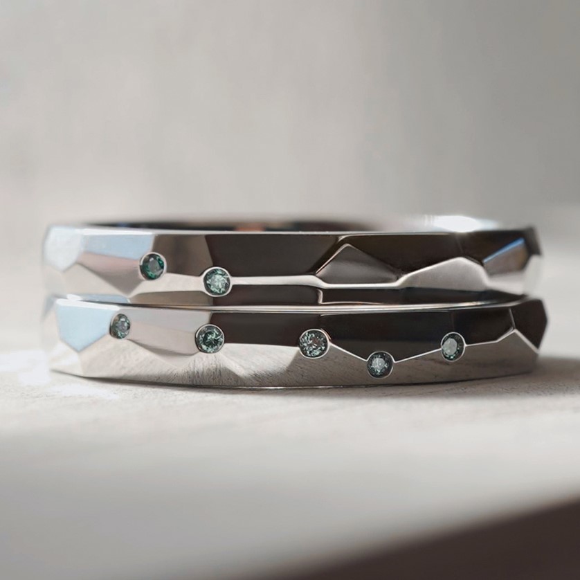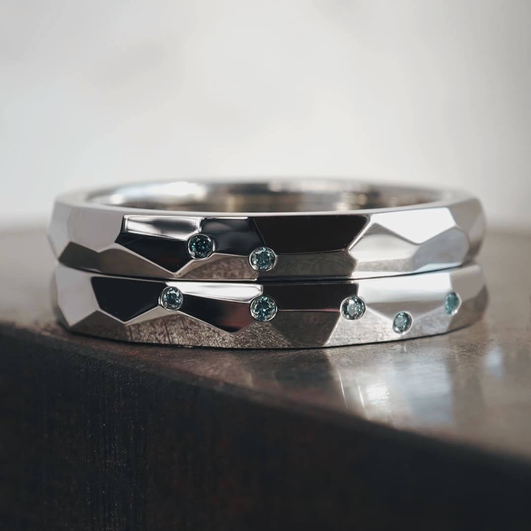 平たい面がいくつも並ぶデザイン 面と面に出来上がる山の線で北斗七星を作り上げました 留めているダイヤモンド種類はアイスブルーダイヤ6石とブルーダイヤ1石です