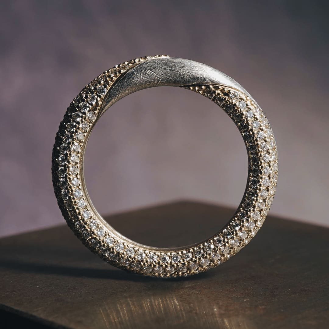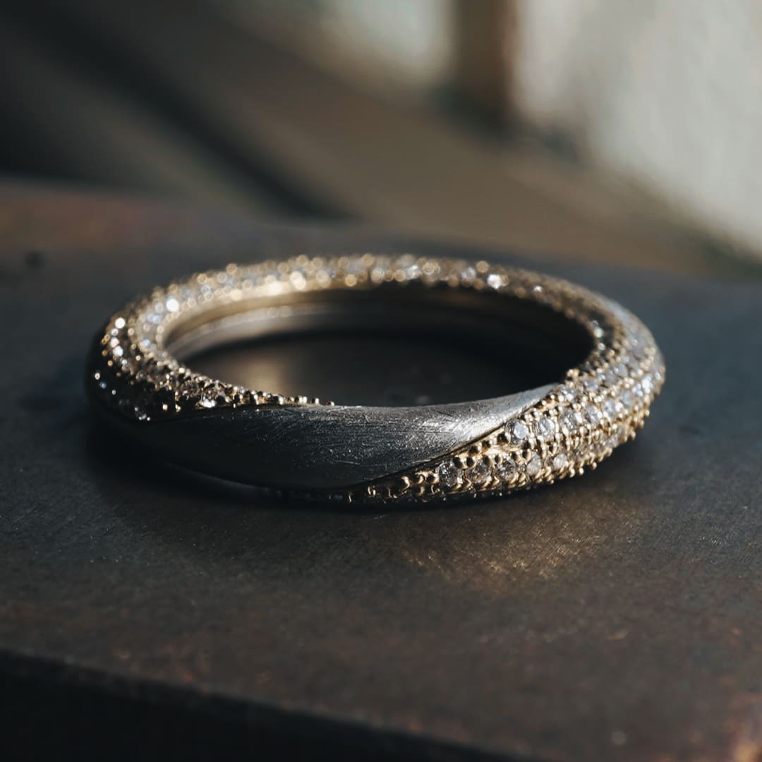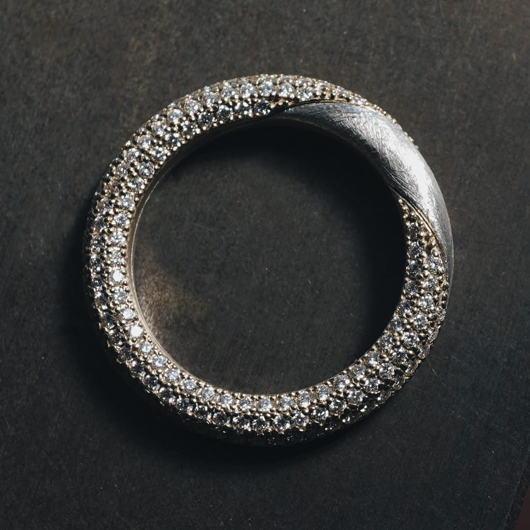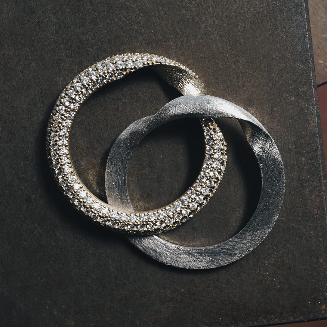 新しい形の Gimmel Ring ふたつの指輪が離れることのない、2つで1つの指輪 片方の指輪全体にダイヤモンドを留めた華やかなデザイン サイズによって素材費が変わってきます お見積りいたしますのでご相談ください