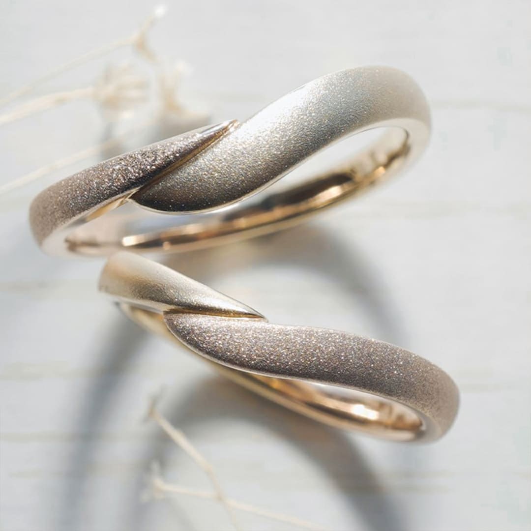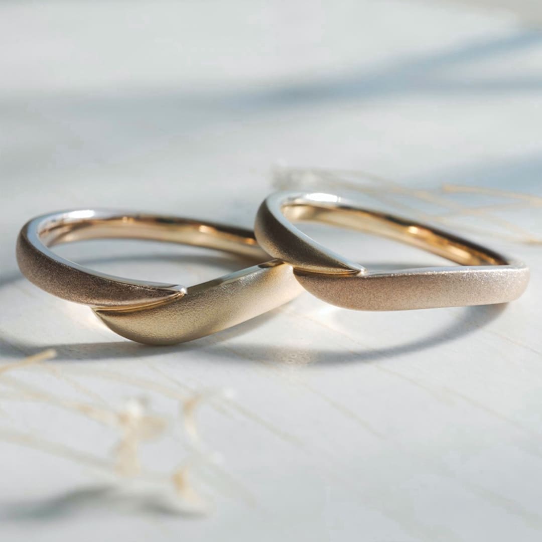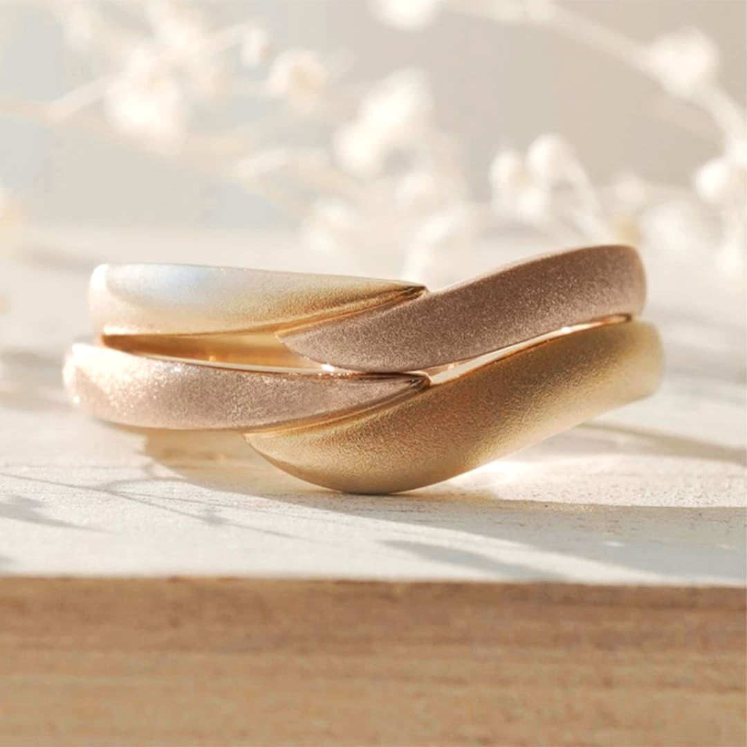 Men’s(左):K18シャンパンゴールド トップ幅約4.0mm(重なり合う部分) バック幅約2.4mm 厚み平均1.6mm Lady’s(右):K18シャンパンゴールド トップ幅約3.1mm(重なり合う部分) バック幅約2.2mm 厚み平均1.6mm