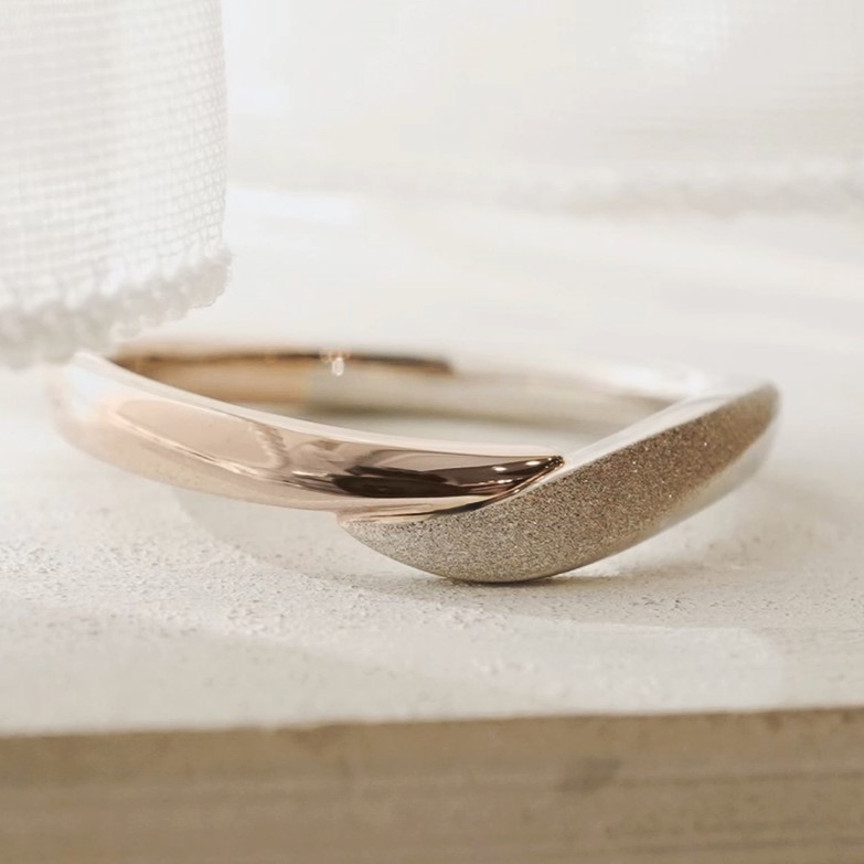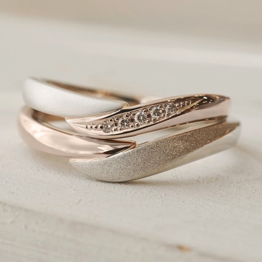 Lady’s(右):K18ラベンダーゴールド×PT900 トップ幅約3.1mm(重なり合う部分) バック幅約2.2mm 厚み平均1.6mm