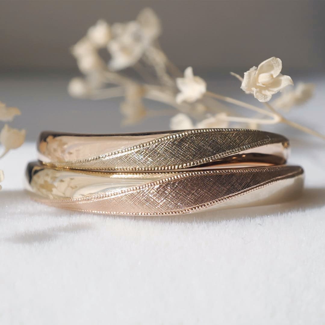 Lino/リノのM幅セット 画像リングはシネマゴールドとローズゴールドの組み合わせになります 表面加工はダイヤモンドパウダーと艶消しホーニング加工仕上げです