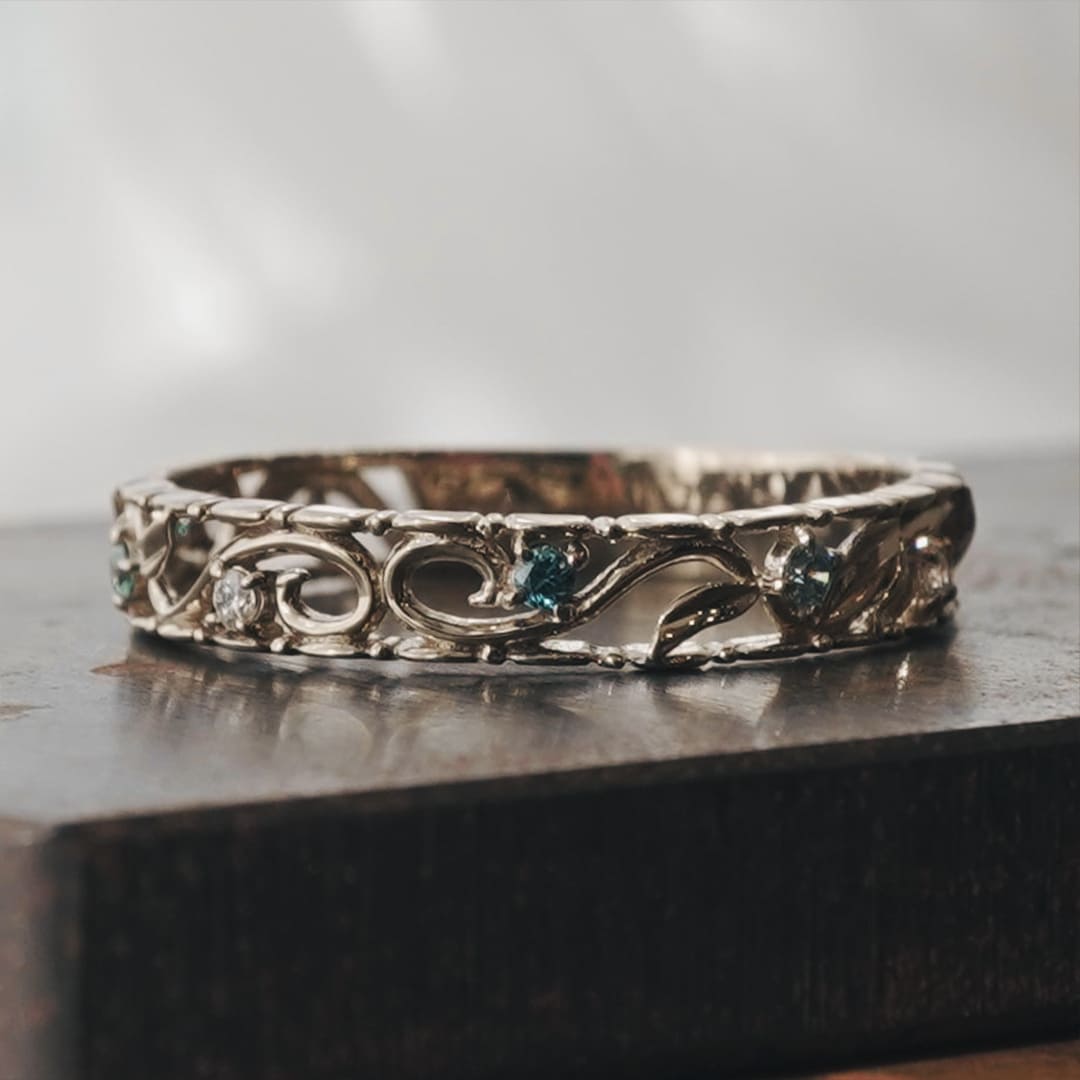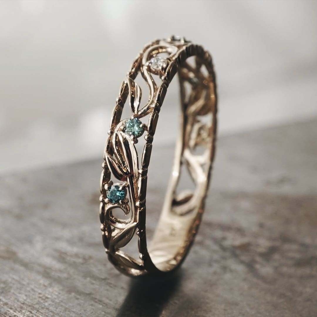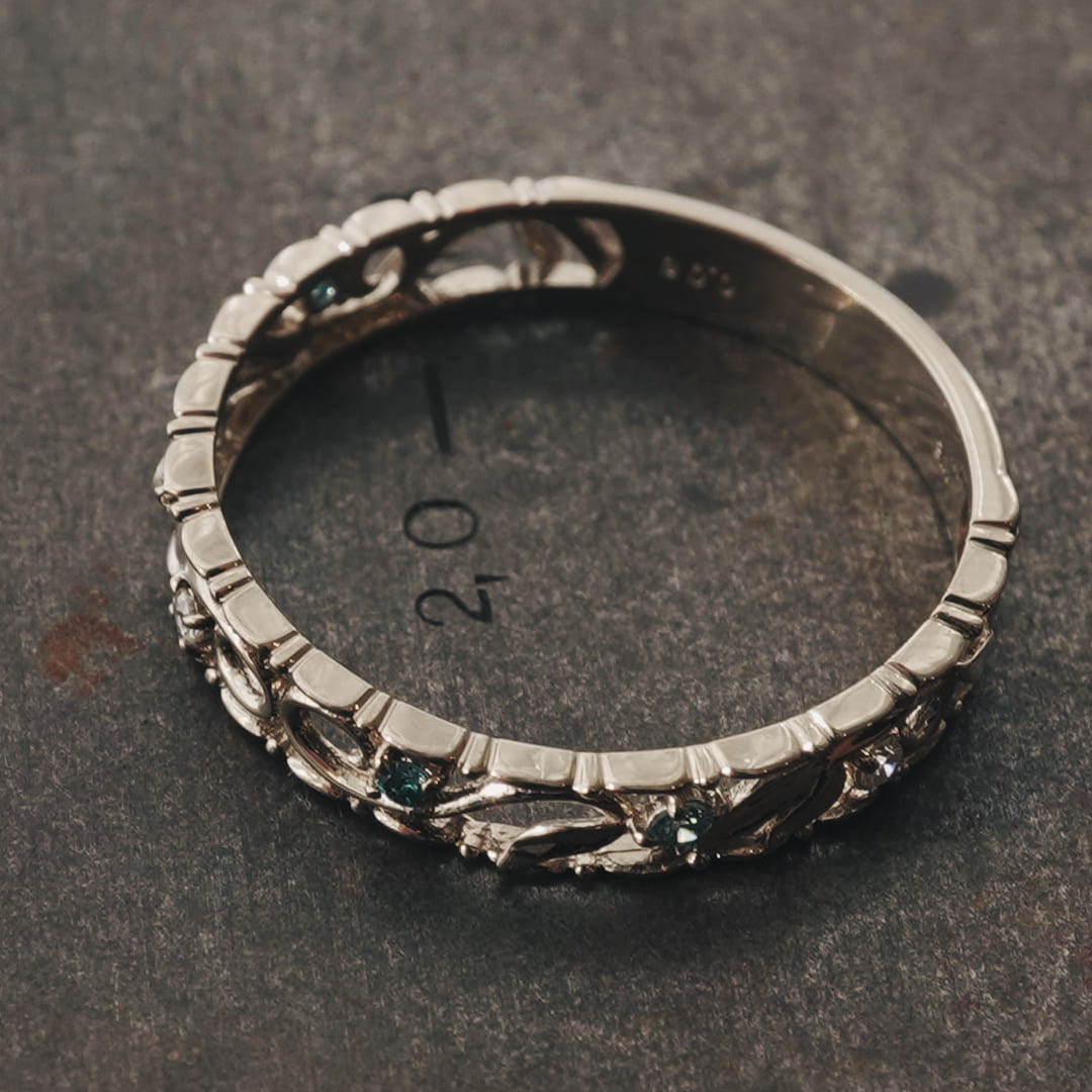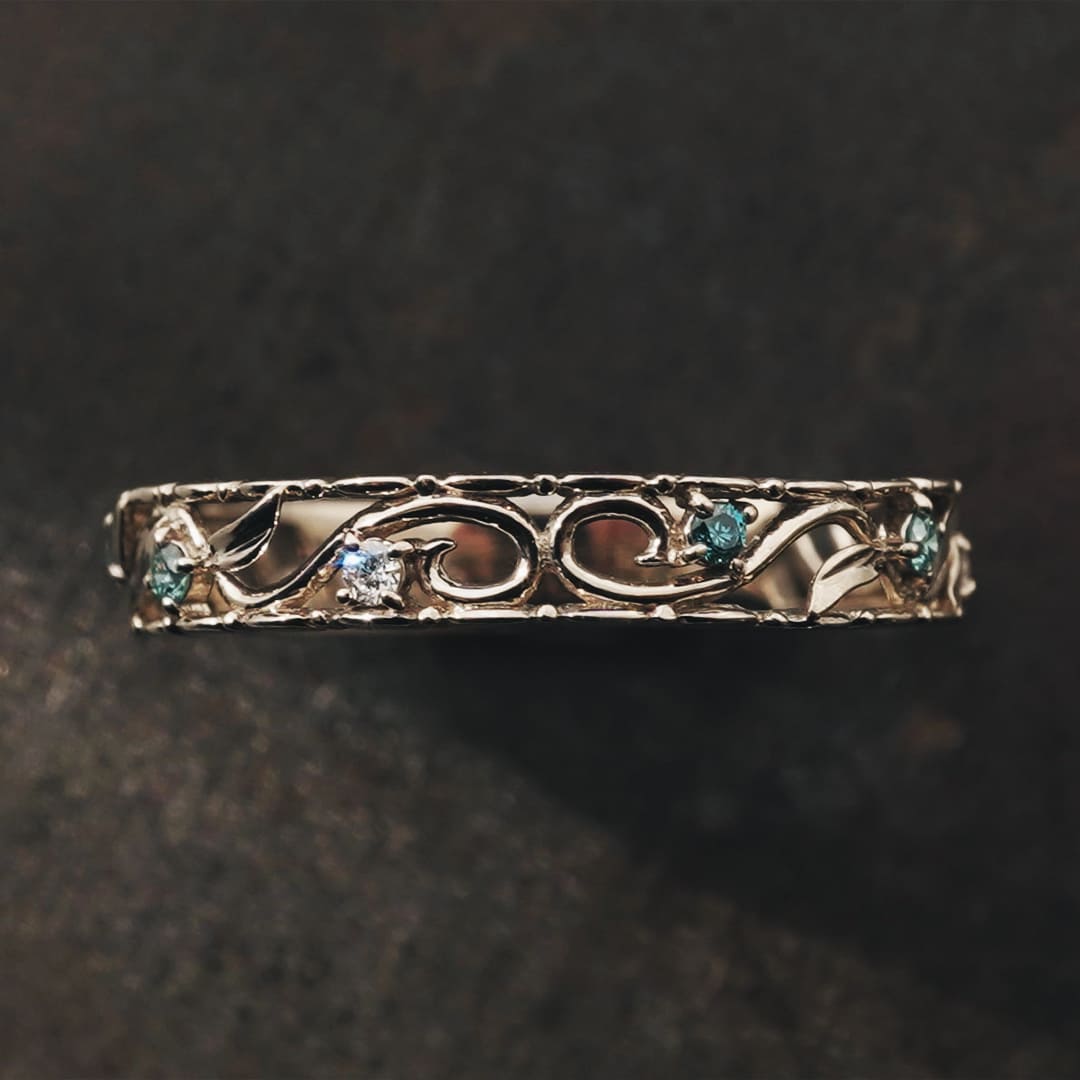 K18シャンパンゴールド 幅平均3.5mm 厚み平均1.7mm ブルーダイヤモンド2石 アイスブルーダイヤモンド2石 ホワイトダイヤモンド2石 0.06ct