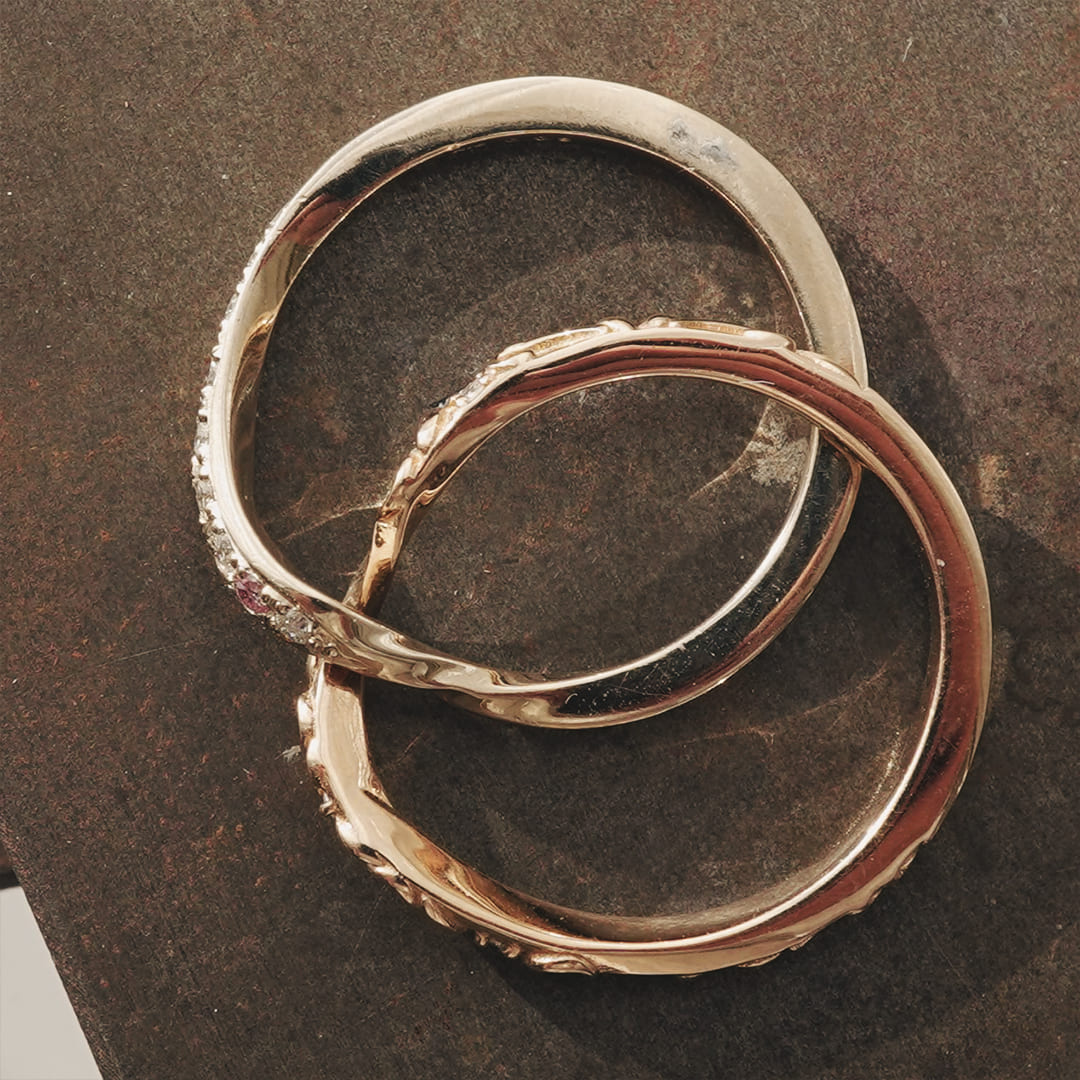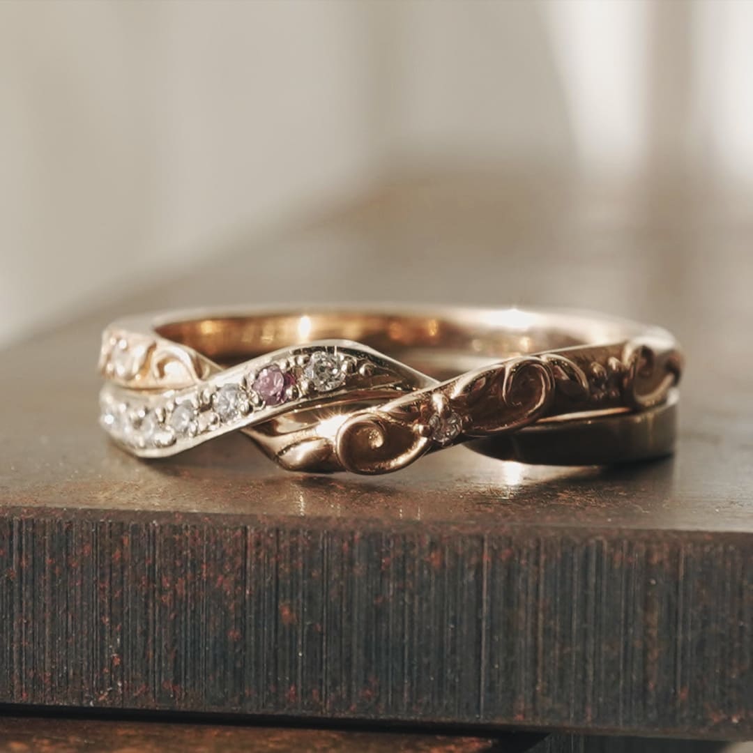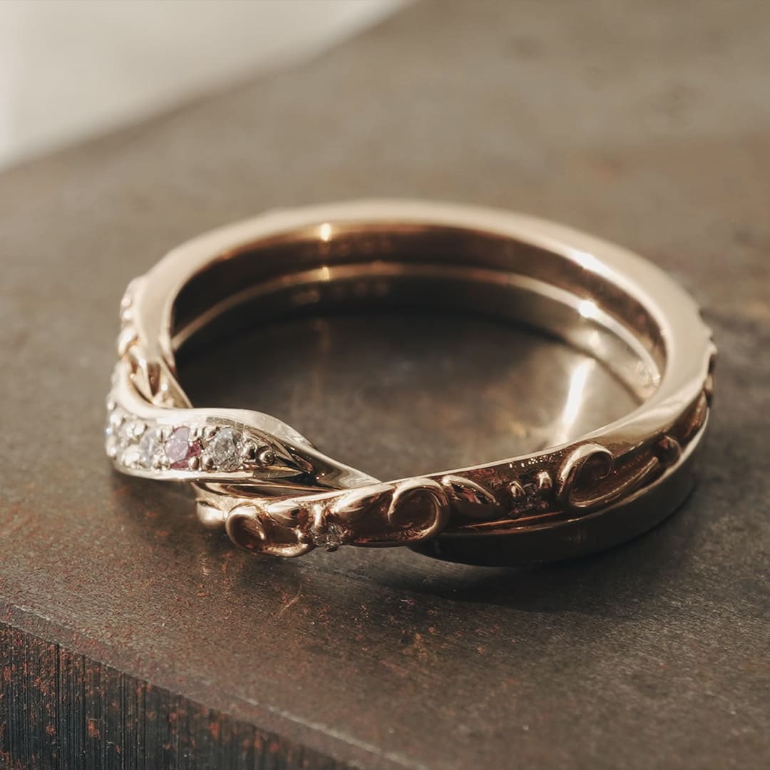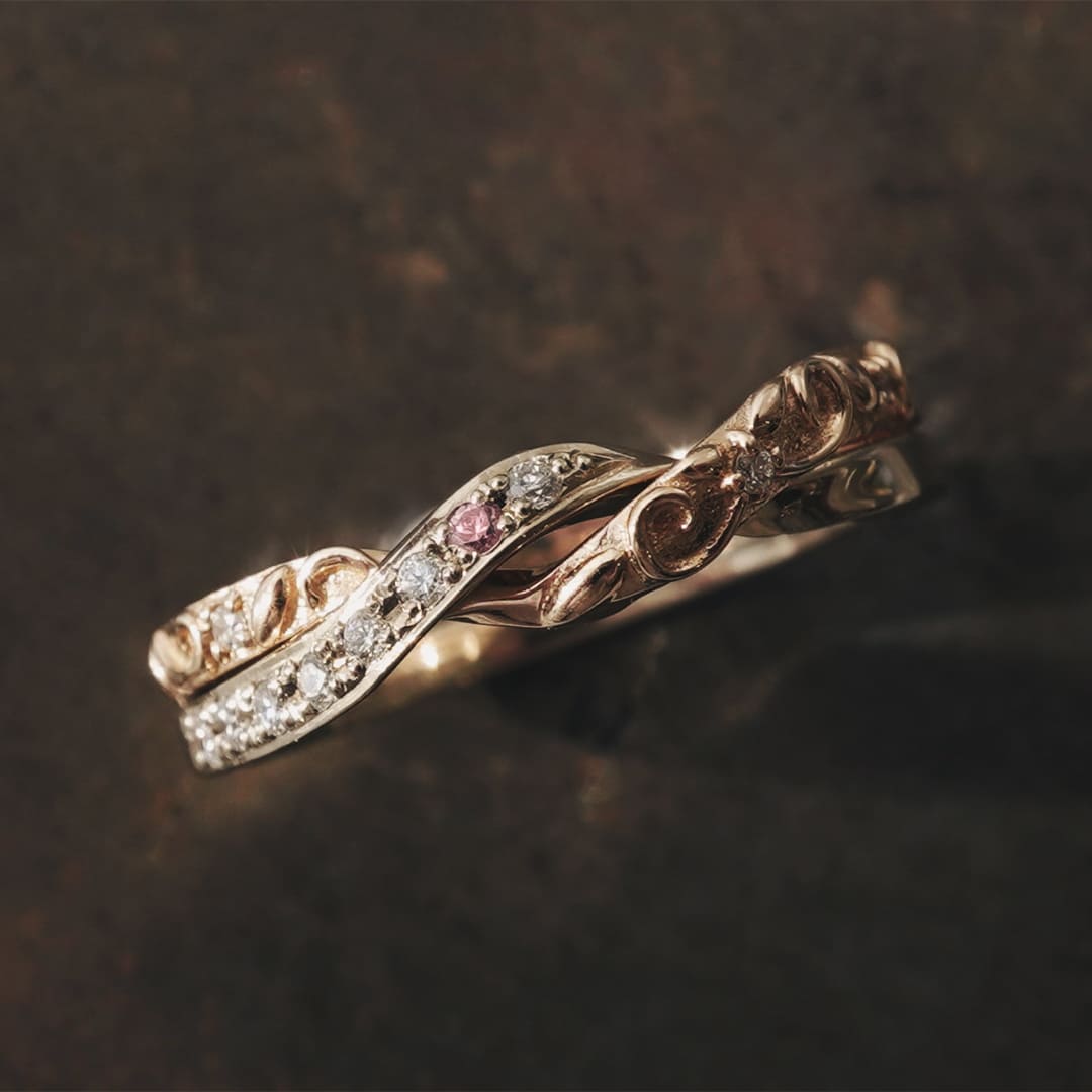 永遠に続く愛のカタチをギメルで表現 ふたつの指輪が離れることのない、ふたつで一つのギメルリングに唐草模様が追加されました 1石ピンクダイヤモンドを留めていますが、変更も可能です Men’sリングは記載ございませんがFeering ギメルリングをご覧ください 単品でのご購入も可能です