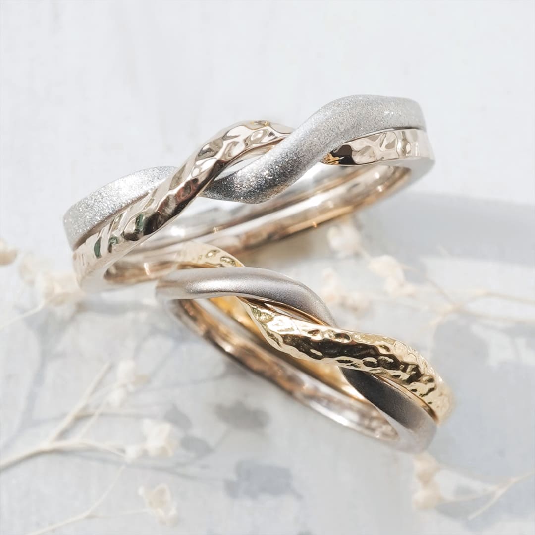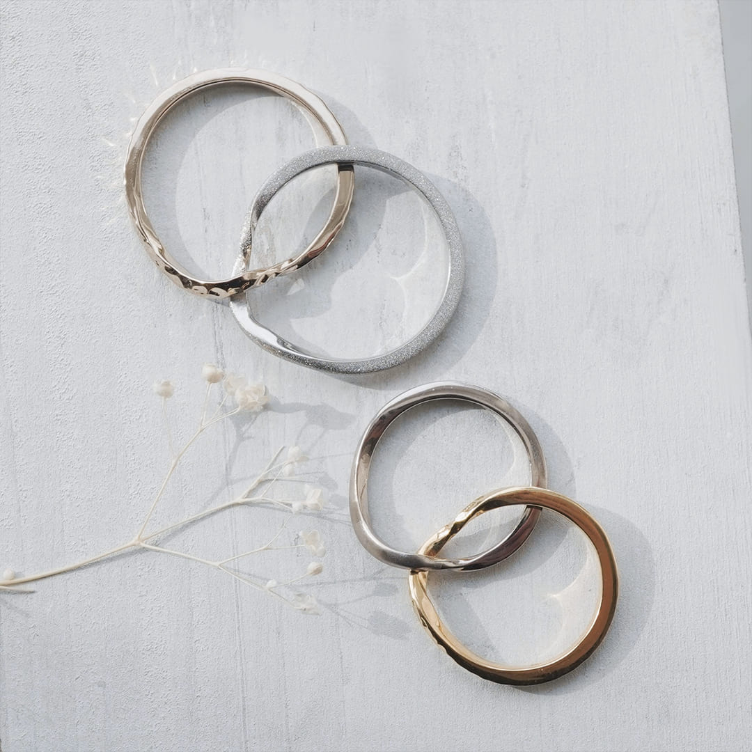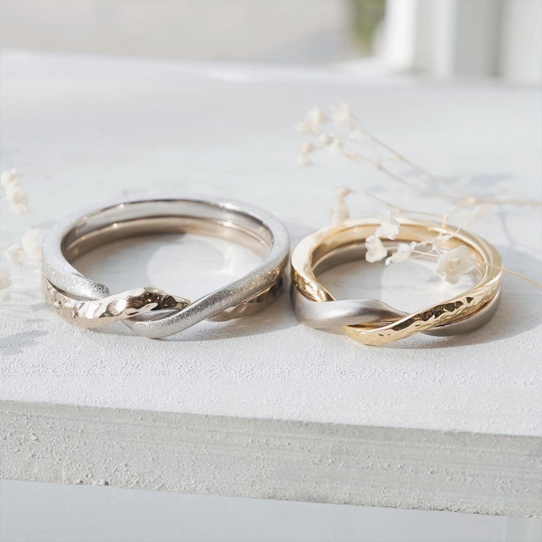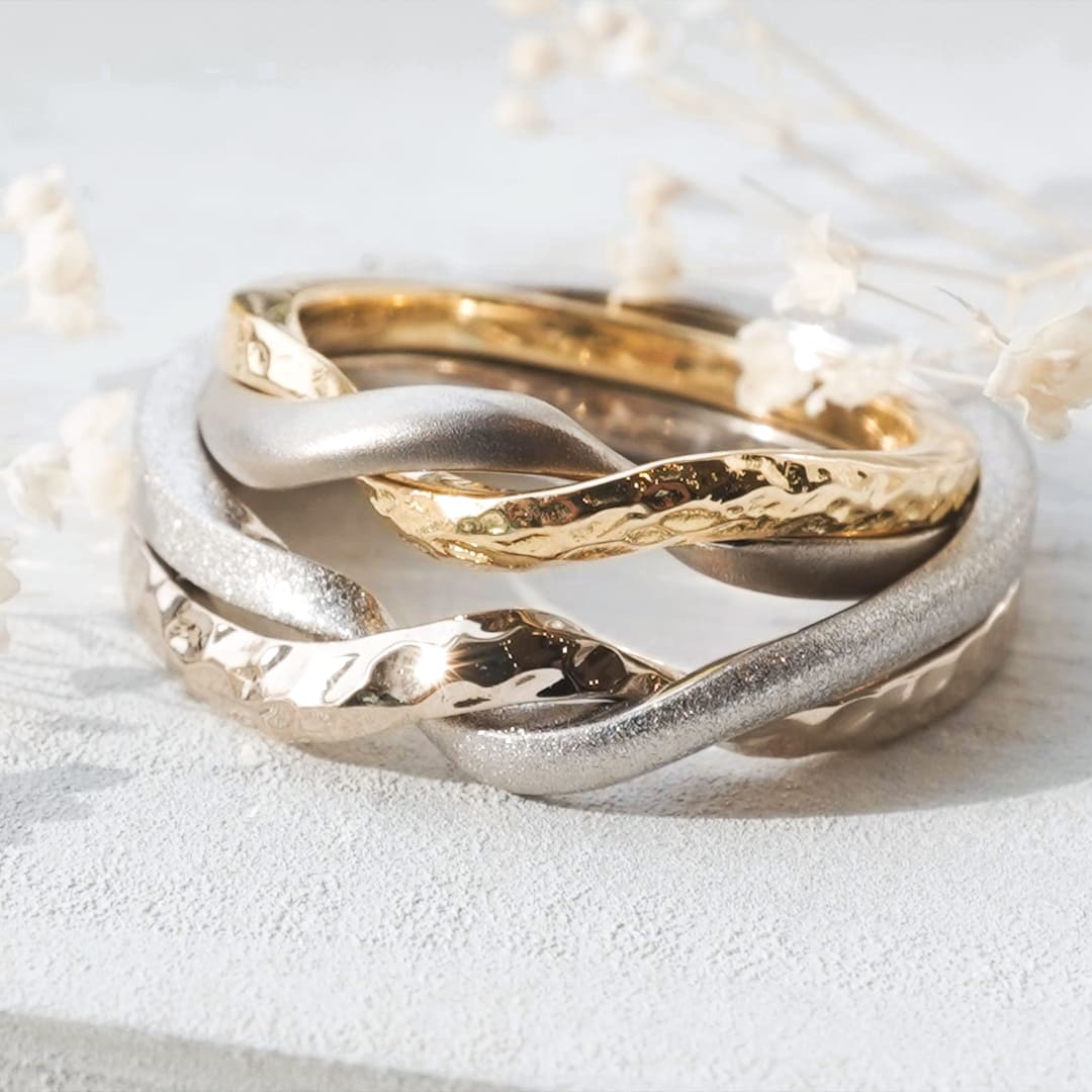 水面に光が反射してきらきらと輝く様子をギメルリング槌目で表現 ふたつの指輪が離れることのない、2つで1つのギメルリングに槌目が追加されました 槌目部分は鏡面仕上げですが、他の表面加工にアレンジいただくことも可能です 単品でのご購入も可能です