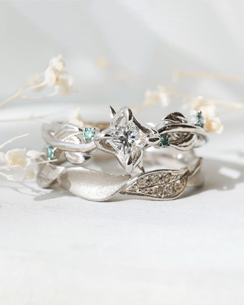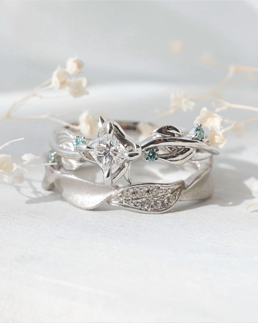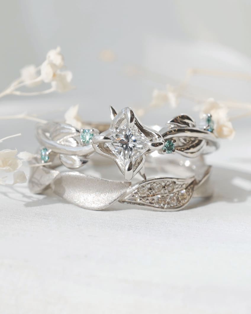 植物がプリンセスカットダイヤモンドを取り巻くように作製した婚約指輪 所々に留まる小さいな石はすべてアイスブルーダイヤです