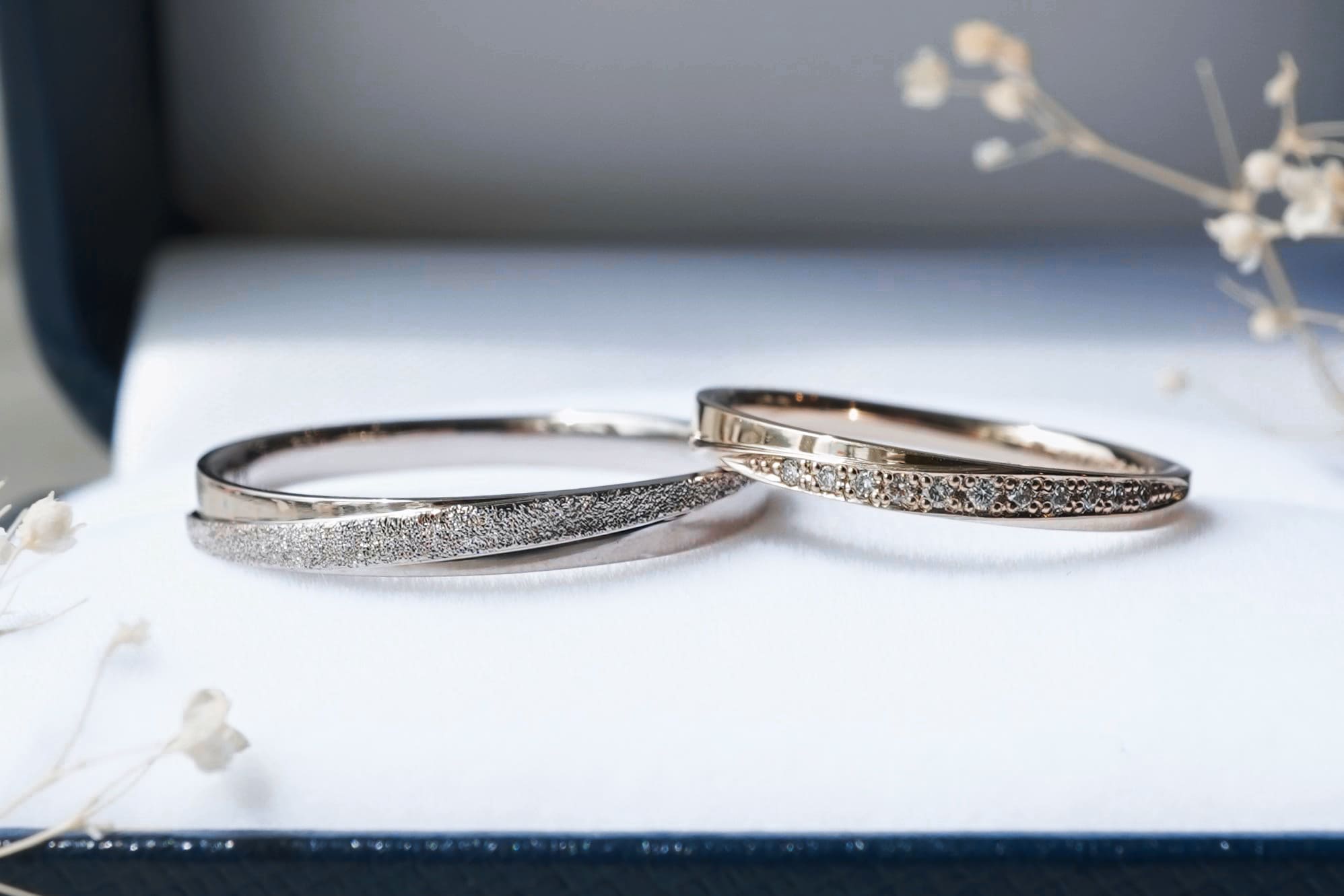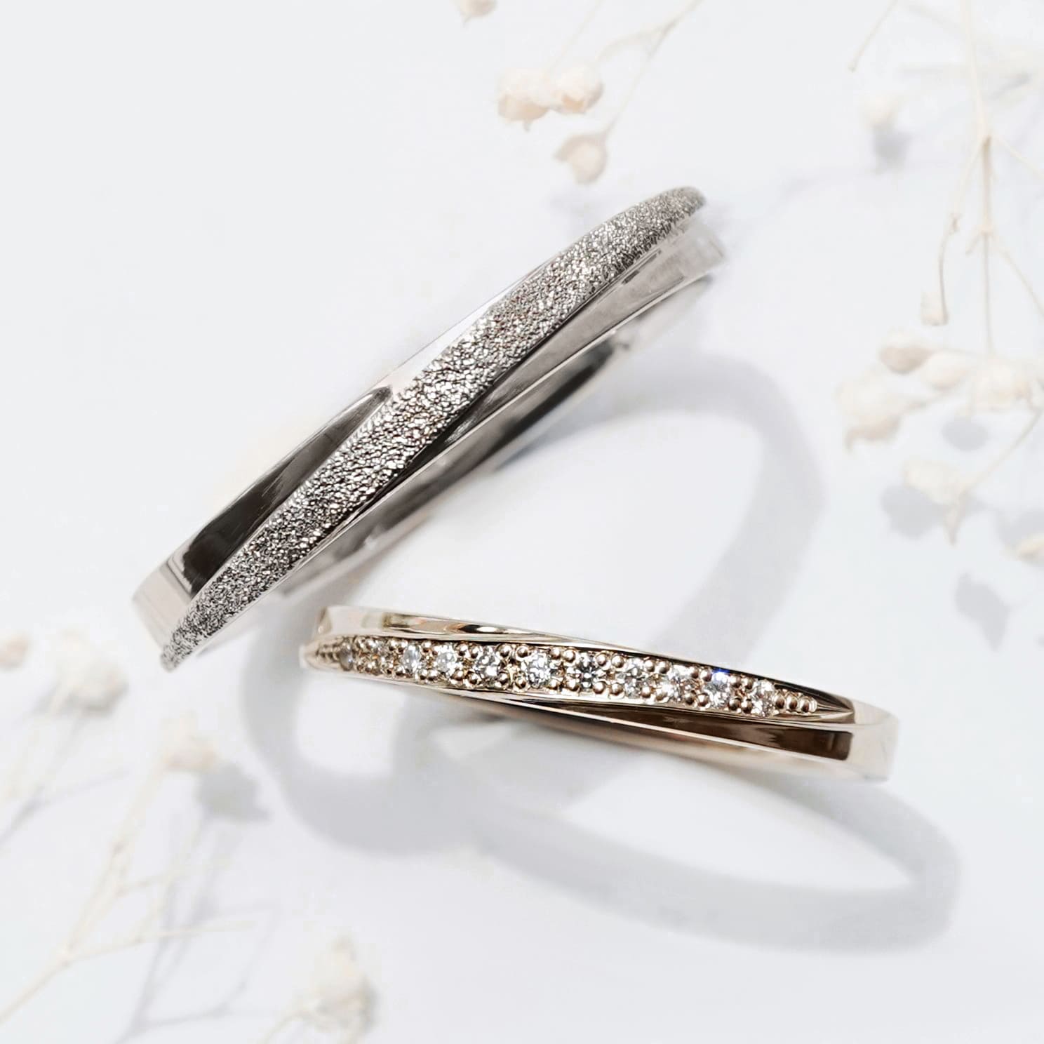 お揃いのデザインでも、ダイヤモンドの輝きと、スターダスト加工の輝きで少し違いを出し、おふたりの個性を感じられる指輪が出来上がりました。