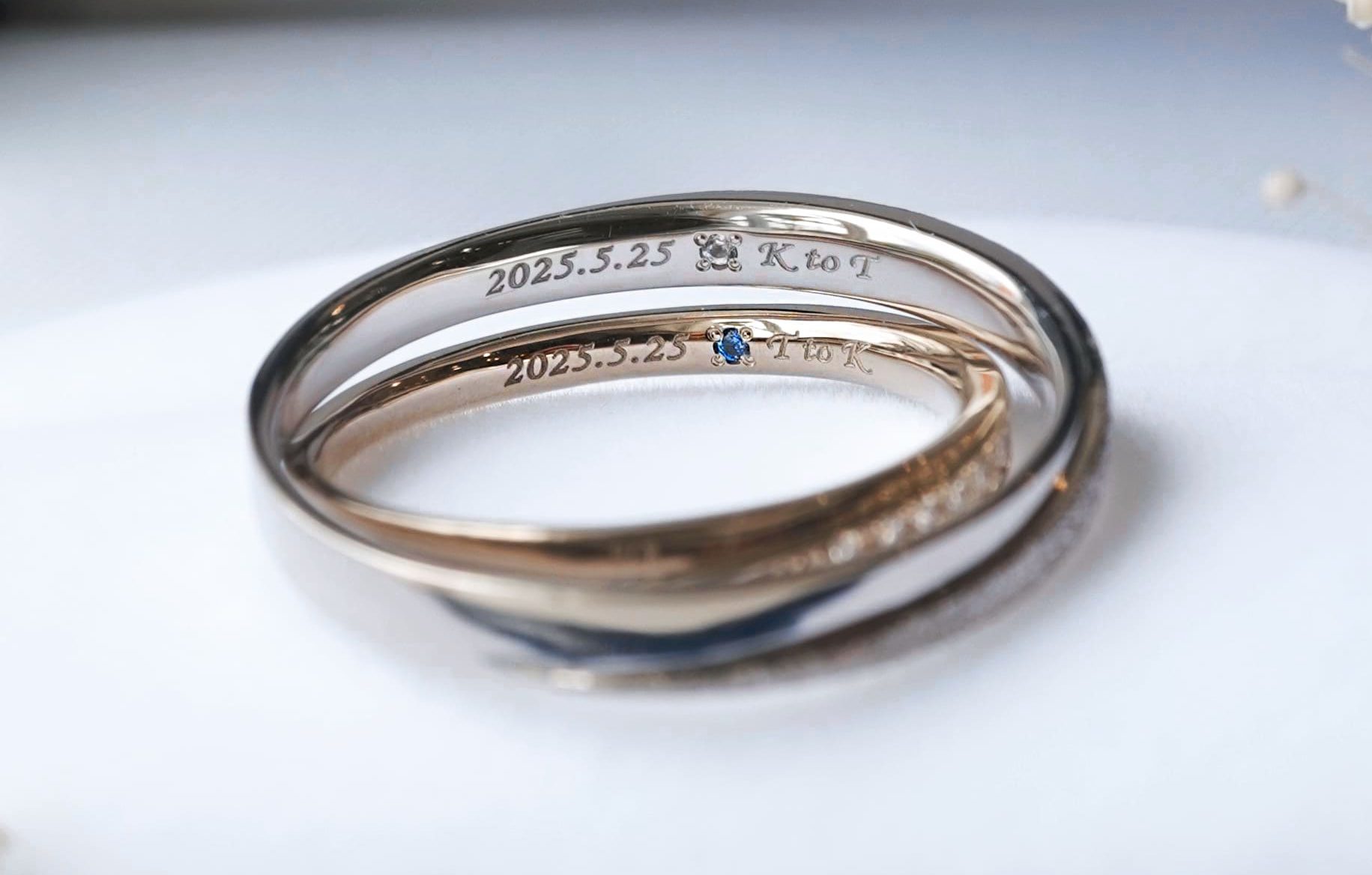 指輪の内側には、おふたりの記念日とイニシャルがレーザーにて刻印されており、その間には、おふたりの誕生石のムーンストーンとサファイアがそれぞれ留められています。