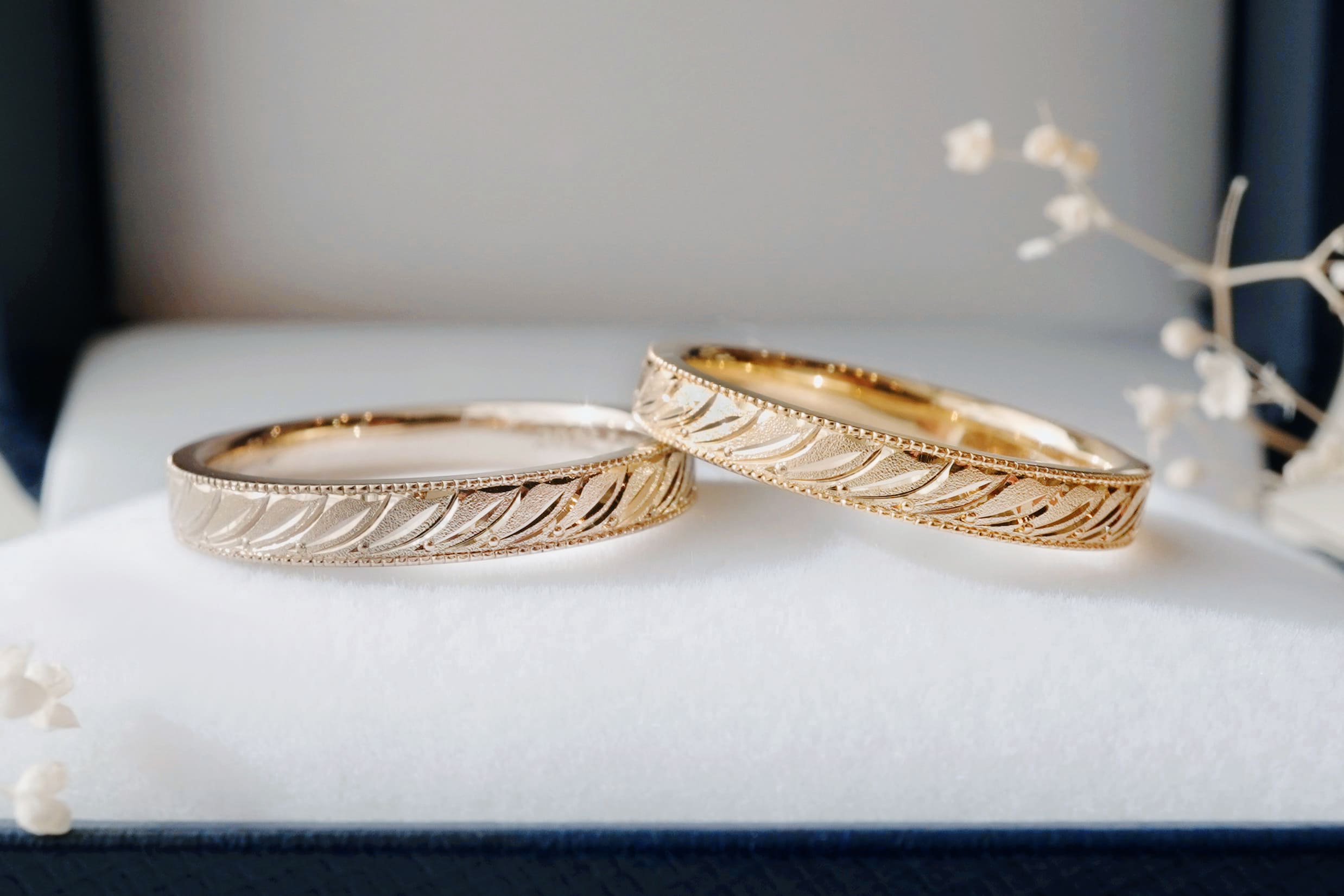 表面加工はどちらもつや消し加工を施し、幅は、通常よりも太めの3㎜でオーダーいただき、上下のミルグレインと真ん中の月桂樹模様がより際立つデザインに。