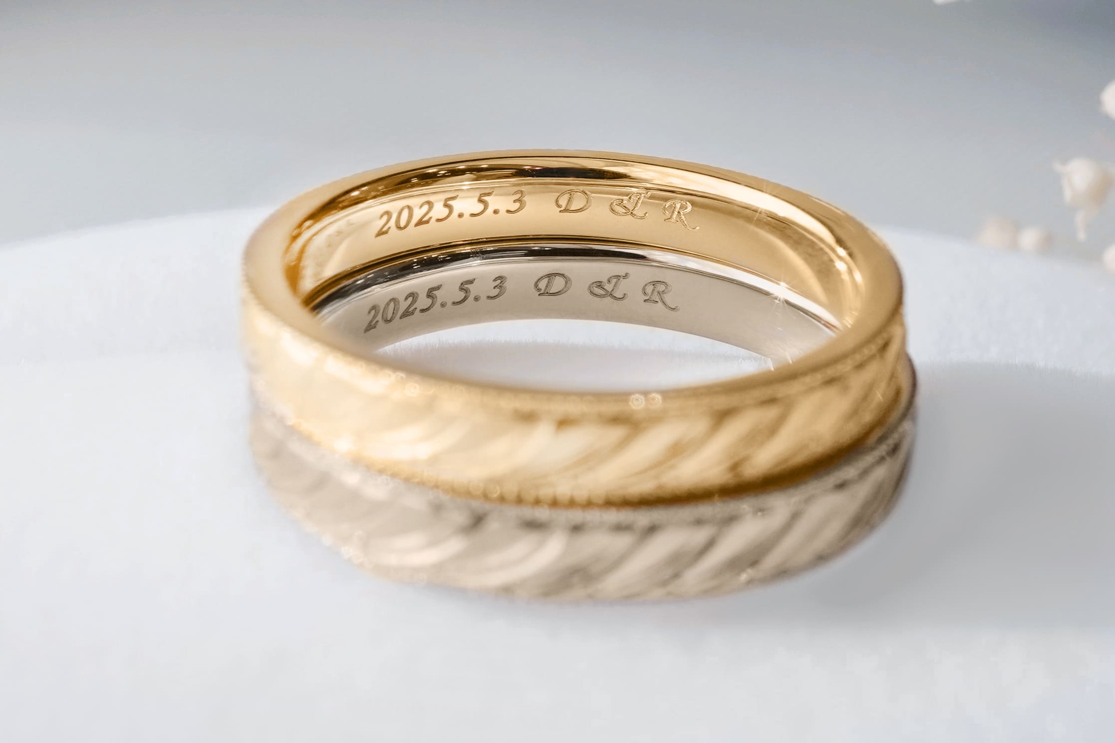 指輪の内側には、おふたりの記念日とイニシャルがレーザーにて刻印されています。