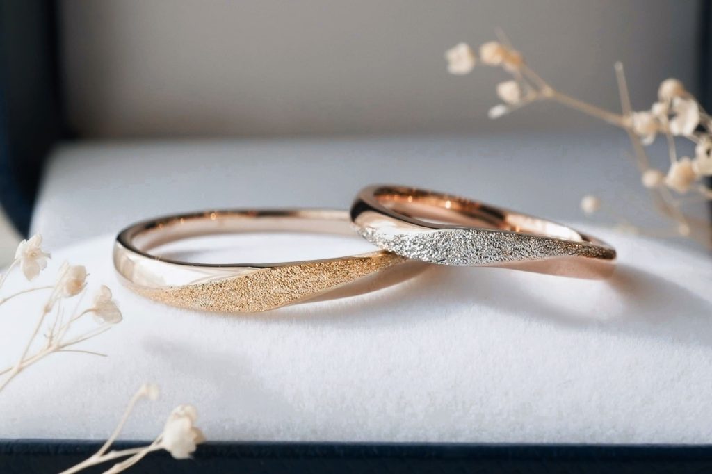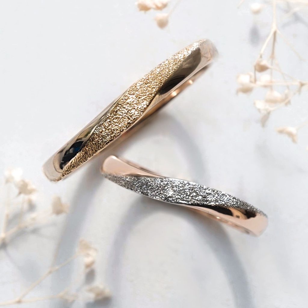 スターダスト加工を施したウェーブデザインの結婚指輪をオーダーいただきましたのでご紹介いたします。