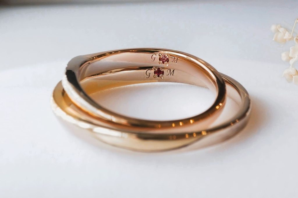 デザインと表面加工はお揃いにして、素材はそれぞれお好きなものを組合わせて、こだわりの詰まった素敵な指輪が出来上がりました。
