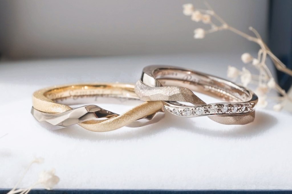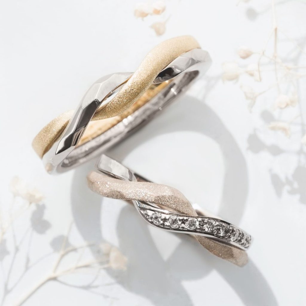 お揃いのデザインや表面加工で統一感を出しつつ、素材はそれぞれお好きな組み合わせにし、おふたりのこだわりの詰まった素敵な指輪が出来上がりました。