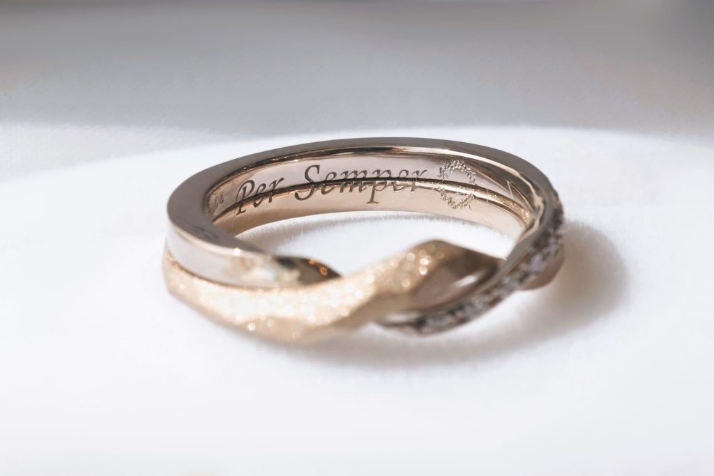 おふたりがお選びいただいたのは、2本が重なり合って1つになるギメルリング。それはまさに、異なる人生を歩んできたおふたりが、これからは手を取り合い、ひとつの未来を築いていく姿そのものです。