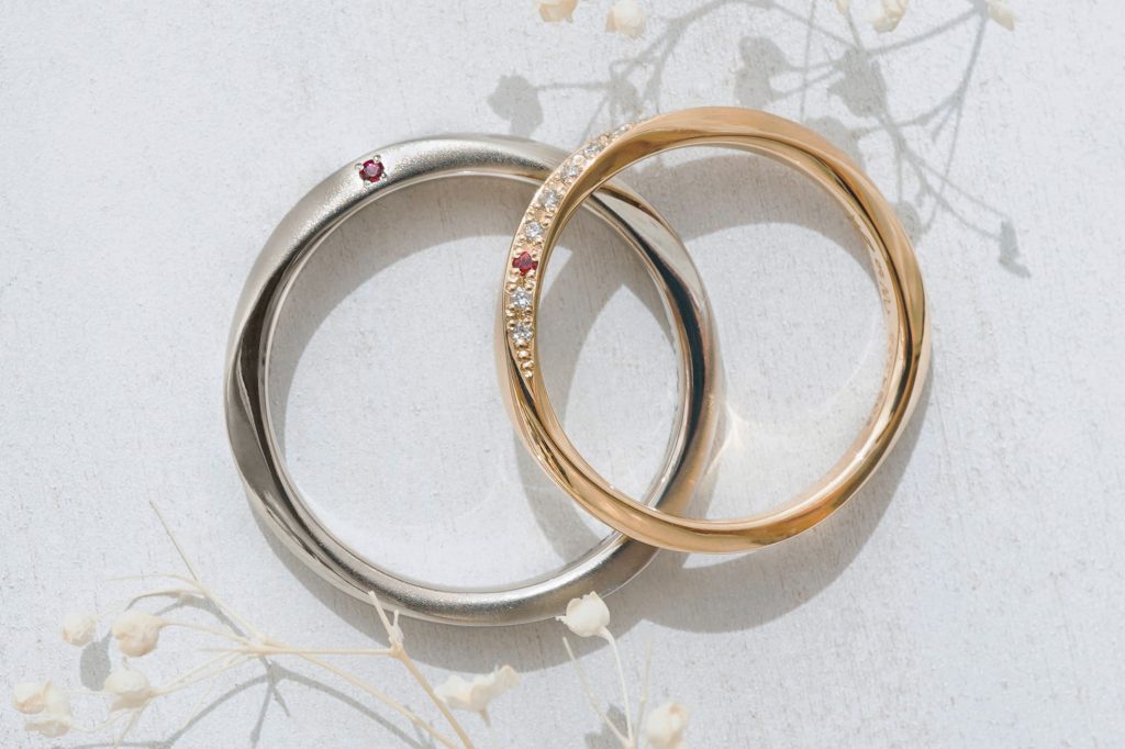 側面にルビーをあしらった、ひねりのラインが印象的なデザインには、おふたりのこだわりがたくさん詰まっていて、とても素敵な仕上がりになりました。