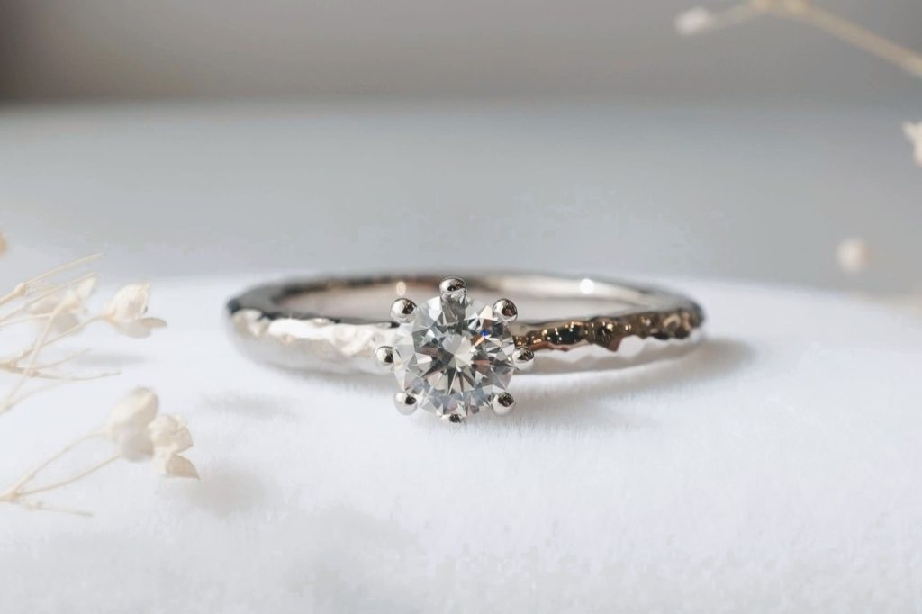 槌目加工が施された婚約指輪となめらかなウェーブデザインの結婚指輪をオーダーいただきましたのでご紹介いたします。