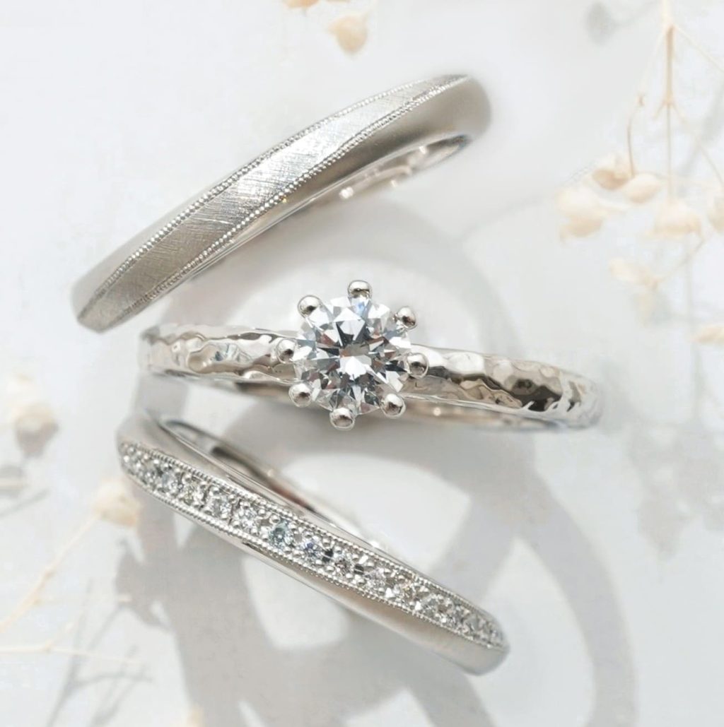 槌目加工が施された婚約指輪となめらかなウェーブデザインの結婚指輪をオーダーいただきましたのでご紹介いたします。