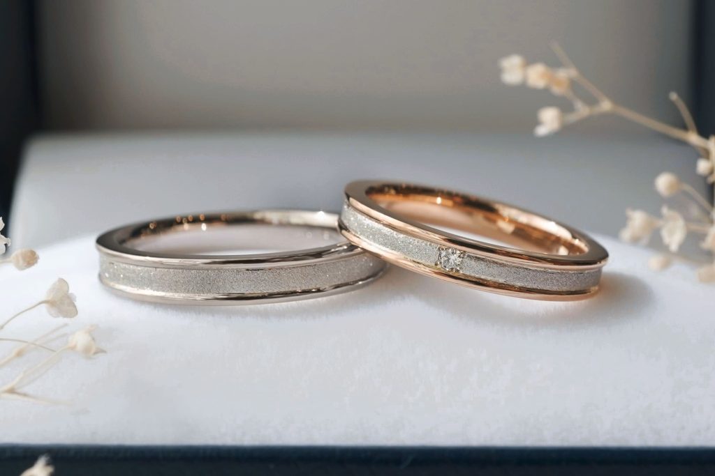 キラキラときめ細やかに輝く加工を施した結婚指輪をオーダーいただきましたのでご紹介いたします。