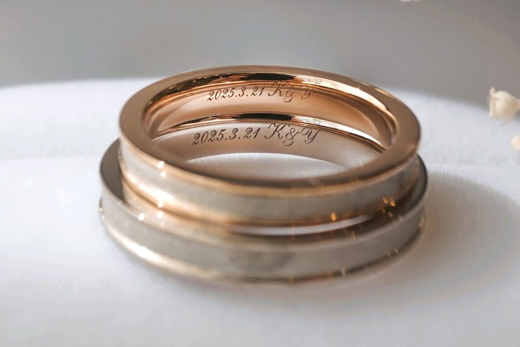 指輪の内側には、おふたりの記念日とイニシャルがレーザーにて刻印されています。