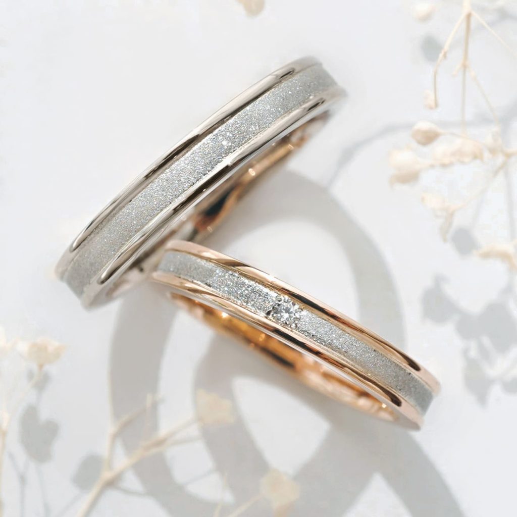 どちらも中央のPt900部分には、きめ細やかな輝きのダイヤモンドパウダー加工を施し、縁部分は鏡面仕上げで。