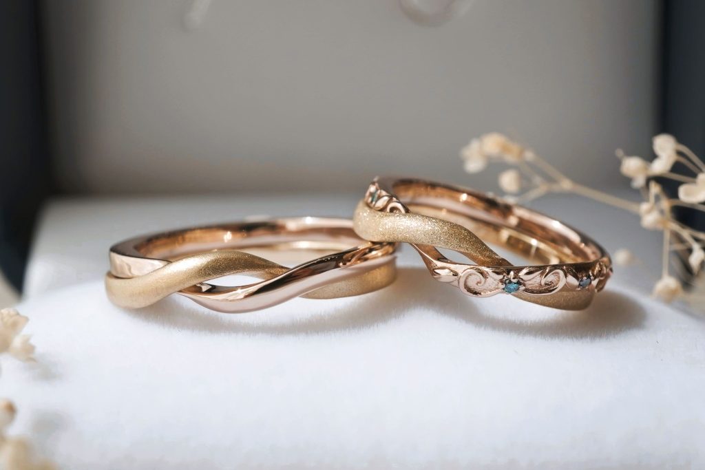 おふたりとも同じ素材のギメルリングにし、その中でも表面のデザインや加工をアレンジすることで、それぞれの個性も感じることのできる素敵な指輪が出来上がりました。