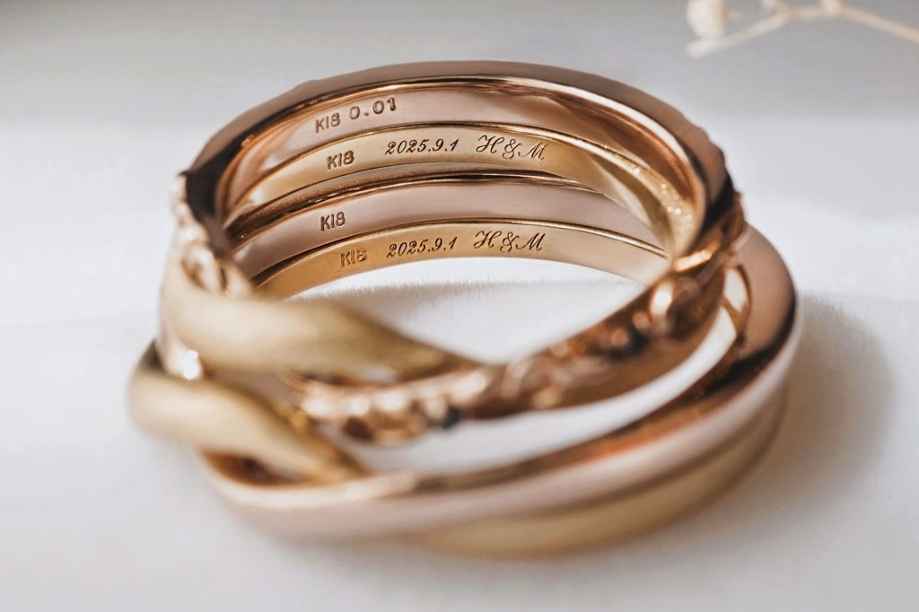 指輪の内側には、おふたりの記念日とイニシャルがレーザーにて、下段のK18シネマゴールド側に刻印されています。
