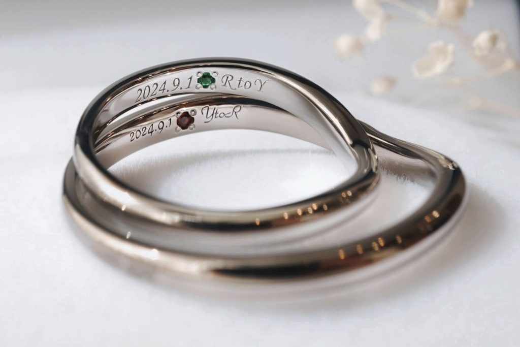 指輪の内側には、おふたりの記念日とイニシャルがレーザーにて刻印されています。