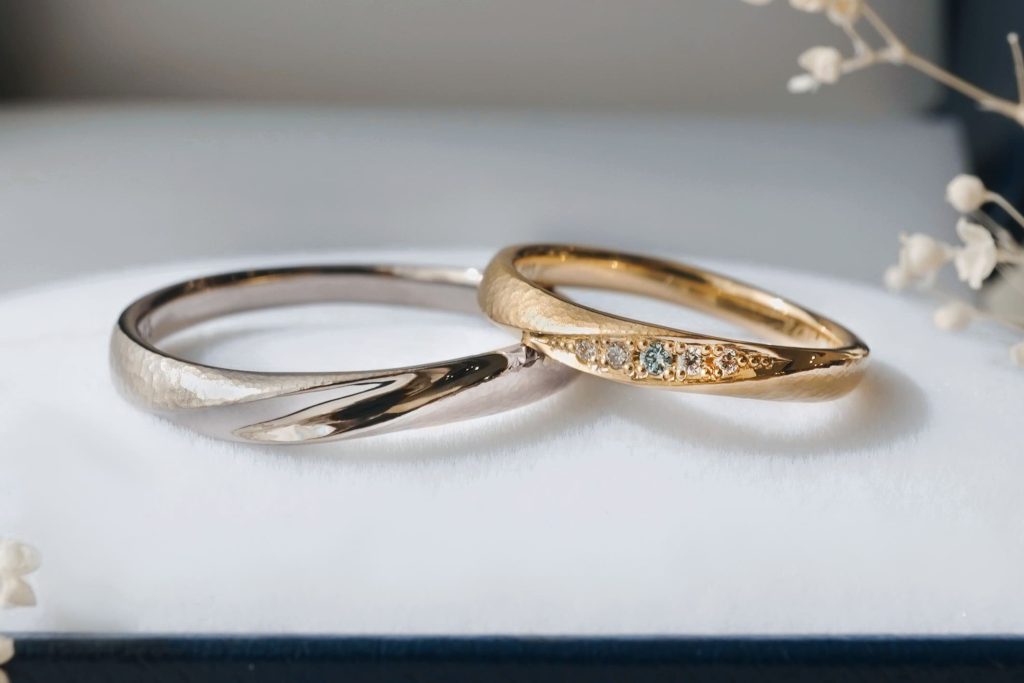 デザインはおふたりお揃いにし、素材やダイヤでアレンジを加え、それぞれの個性も感じることのできる素敵な指輪が出来上がりました。